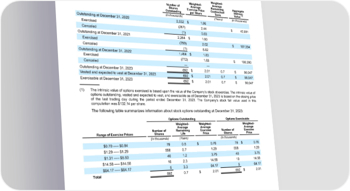 Table of Contents ENPHASE ENERGY, INC. NOTES TO CONSOLIDATED FINANCIAL STATEMENTS Equity Awards Activity Stock Options The following table summarizes stock option activity: Weighted- Weighted- Average Number of Average Remaining Aggregate Shares Exercise Price Contractual Intrinsic (1) Outstanding per Share Term Value (In thousands) (Years) (In thousands) Outstanding at December 31, 2020 2,532 $ 1.96 Exercised (267) 2.44 $ 42,091 Canceled (1) 0.83 Outstanding at December 31, 2021 2,264 $ 1.90 Exercised (799) 2.02 $ 197,334 Canceled (1) 8.82 Outstanding at December 31, 2022 1,464 $ 1.83 Exercised (772) 1.68 $ 100,390 Canceled — — Outstanding at December 31, 2023 692 $ 2.01 0.7 $ 90,047 Vested and expected to vest at December 31, 2023 692 $ 2.01 0.7 $ 90,047 Exercisable at December 31, 2023 692 $ 2.01 0.7 $ 90,047 (1) The intrinsic value of options exercised is based upon the value of the Company’s stock at exercise. The intrinsic value of options outstanding, vested and expected to vest, and exercisable as of December 31, 2023 is based on the closing price of the last trading day during the period ended December 31, 2023. The Company’s stock fair value used in this computation was $132.14 per share. The following table summarizes information about stock options outstanding at December 31, 2023: Options Outstanding Options Exercisable Weighted- Weighted- Weighted- Average Average Average Number of Remaining Exercise Number of Exercise Range of Exercise Prices Shares Life Price Shares Price (In thousands) (Years) (In thousands) $0.70 —– $0.84 79 0.5 $ 0.76 79 $ 0.76 $1.29 —– $1.29 558 0.7 1.29 558 1.29 $1.31 —– $5.53 40 1.2 3.75 40 3.75 $14.58 —– $14.58 10 2.3 14.58 10 14.58 $64.17 —– $64.17 5 3.3 64.17 5 64.17 Total 692 0.7 $ 2.01 692 $ 2.01 Enphase Energy, Inc. | 2023 Form 10-K | 114