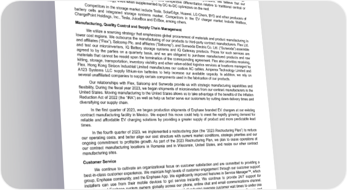 Table of Contents Several of our existing and potential competitors are significantly larger than us and may have greater financial, marketing, distribution and customer support resources and may have significantly broader brand recognition, especially in certain markets. In addition, some of our competitors have more resources and experience in developing or acquiring new products and technologies and in creating market awareness for these offerings. Competitors in the inverter market include, among others, SolarEdge Technologies, Inc. (“SolarEdge”), Tesla, Inc. (“Tesla”), Huawei Technologies Co. Ltd., (“Huawei”), Sungrow Power Supply Co., Ltd., Growatt New Energy Co., Ltd and other companies offering string inverters with and without solar optimizers. We believe that our microinverter solutions offer significant advantages and competitive differentiation relative to traditional central or string inverter technology, even when supplemented by DC-to-DC optimizers on the roof. Competitors in the storage market include Tesla, SolarEdge, Huawei, LG Chem, BYD and other producers of battery cells and integrated storage systems market. Competitors in the EV charger market include Wallbox, ChargePoint Holdings, Inc., Tesla, JuiceBox and EVBox, among others. Manufacturing, Quality Control and Supply Chain Management We utilize a sourcing strategy that emphasizes global procurement of materials and product manufacturing in lower cost regions. We outsource the manufacturing of our products to third-party contract manufacturers. Flex Ltd. and affiliates (“Flex”), Salcomp Plc. and affiliates (“Salcomp”), and Sunwoda Electric Co. Ltd. (“Sunwoda”) assemble and test our microinverters, IQ Battery storage systems and IQ Gateway products. Prices for such services are agreed to by the parties on a quarterly basis, and we are obligated to purchase manufactured products and raw materials that cannot be resold upon the termination of the corresponding agreement. Flex also provides receiving, kitting, storage, transportation, inventory visibility and other value-added logistics services at locations managed by Flex. Hong Kong Sinbon Industrial Limited manufactures our custom AC cables. Amperex Technology Limited and A123 Systems LLC supply lithium-ion batteries to help increase our available capacity. In addition, we rely on several unaffiliated companies to supply certain components used in the fabrication of our products. Our relationships with Flex, Salcomp and Sunwoda provide us with strategic manufacturing capabilities and flexibility. During the fiscal year 2023, we began shipments of microinverters from our contract manufacturers in the United States. Moving manufacturing to the United States allows us to take advantage of the benefits of the Inflation Reduction Act of 2022 (the “IRA”) as well as help us better serve our customers by cutting down delivery times and diversifying our supply chain. In the first quarter of 2023, we began production shipments of Enphase branded EV chargers at our existing contract manufacturing facility in Mexico. We expect this move could help to meet the rapidly growing demand for reliable and affordable EV charging solutions by providing a greater supply of product and more predictable lead times. In the fourth quarter of 2023, we implemented a restructuring plan (the “2023 Restructuring Plan”) to reduce our operating costs, and better align our cost structure with current market conditions, strategic priorities and our ongoing commitment to profitable growth. As part of the 2023 Restructuring Plan, we plan to cease operations at our contract manufacturing locations in Romania and in Wisconsin, United States, and resize our other contract manufacturing sites. Customer Service We continue to cultivate an organizational focus on customer satisfaction and are committed to providing a best-in-class customer experience. We maintain high levels of customer engagement through our customer support group, Enphase community, and the Enphase App. We significantly improved features in Service Manager™, which installers can use from their mobile devices to get service instantly. We continue to provide 24/7 support for installers and Enphase system owners globally across our phone, online chat and email communications channel. We continue to train our customer service agents with a goal of reducing average customer wait times to under one minute, and we continue to expand our network of field service technicians in the United States, Europe and Australia to provide direct homeowner assistance. Our Net Promoter Score (commonly referred to as “NPS”) improved to 76% in 2023 from 69% in 2022 as a result of multiple customer service initiatives. Enphase Energy, Inc. | 2023 Form 10-K | 12