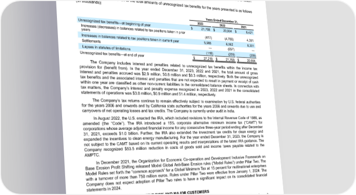Table of Contents ENPHASE ENERGY, INC. NOTES TO CONSOLIDATED FINANCIAL STATEMENTS The Company does not have any tax positions for which it is reasonably possible the total amount of gross unrecognized tax benefits will increase or decrease over the next year. The unrecognized tax benefits may increase or change during the next year for items that arise in the ordinary course of business. As of December 31, 2023, the total amount of gross unrecognized tax benefits was $27.2 million, of which $25.4 million, if recognized, would impact the Company’s effective tax rate. A tabular reconciliation of the total amounts of unrecognized tax benefits for the years presented is as follows (in thousands): Years Ended December 31, 2023 2022 2021 Unrecognized tax benefits—at beginning of year $ 21,768 $ 20,904 $ 8,421 Increases (decreases) in balances related to tax positions taken in prior years (417) (4,786) 4,391 Increases in balances related to tax positions taken in current year 5,985 6,562 8,301 Settlements — (657) — Lapses in statutes of limitations (118) (255) (209) Unrecognized tax benefits—at end of year $ 27,218 $ 21,768 $ 20,904 The Company includes interest and penalties related to unrecognized tax benefits within the income tax provision for (benefit from). In the year ended December 31, 2023, 2022 and 2021, the total amount of gross interest and penalties accrued was $2.9 million, $0.8 million and $0.3 million, respectively. Both the unrecognized tax benefits and the associated interest and penalties that are not expected to result in payment or receipt of cash within one year are classified as other non-current liabilities in the consolidated balance sheets. In connection with tax matters, the Company’s interest and penalty expense recognized in 2023, 2022 and 2021 in the consolidated statements of operations was $3.8 million, $0.9 million and $1.4 million, respectively. The Company’s tax returns continue to remain effectively subject to examination by U.S. federal authorities for the years 2006 and onwards and by California state authorities for the years 2006 and onwards due to use and carryovers of net operating losses and tax credits. The Company is currently under audit in India. In August 2022, the U.S. enacted the IRA, which included revisions to the Internal Revenue Code of 1986, as amended (the “Code”). The IRA introduced a 15% corporate alternative minimum income tax (“CAMT”) for corporations whose average adjusted financial income for any consecutive three-year period ending after December 31, 2021, exceeds $1.0 billion. Further, the IRA also extended the investment tax credits for clean energy and expanded the incentives to clean energy manufacturing. For the year ended December 31, 2023, the Company is not subject to the CAMT based on its current operating results and interpretations of the latest IRA guidance. The Company recognized $53.5 million reduction in costs of goods sold and income taxes payable related to the AMPTC. In December 2021, the Organization for Economic Co-operation and Development Inclusive Framework on Base Erosion Profit Shifting released Model Global Anti-Base Erosion rules (“Model Rules”) under Pillar Two. The Model Rules set forth the “common approach” for a Global Minimum Tax at 15 percent for multinational enterprises with a turnover of more than 750 million euros. Rules under Pillar Two were effective from January 1, 2024. The Company does not expect adoption of Pillar Two rules to have a significant impact on its consolidated financial statements in 2024. 18. CONCENTRATION OF CREDIT RISK AND MAJOR CUSTOMERS The Company is potentially subject to financial instrument concentration of credit risk through its cash, cash equivalents, marketable securities, and accounts receivable. The Company places its cash, cash equivalents and marketable securities with high quality institutions and performs periodic evaluations of their relative credit standing. Accounts receivable can be potentially exposed to a concentration of credit risk with its major customers. As of December 31, 2023 and 2022, amounts due from one customer represented approximately 40% and 24%, respectively, of the total accounts receivable balance. Enphase Energy, Inc. | 2023 Form 10-K | 119