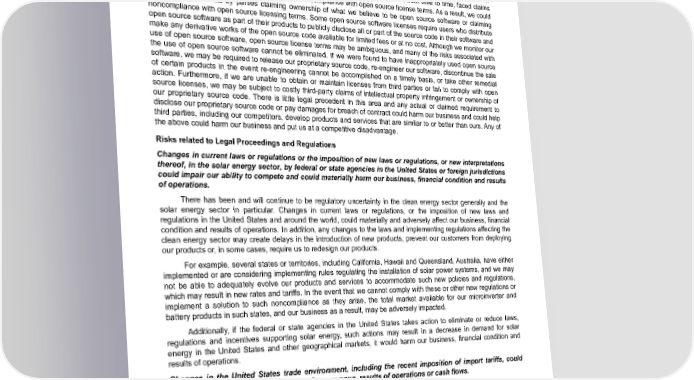 Table of Contents commercializing products or services, and the prohibition of sale or the threat of the prohibition of sale of any of our products or services could materially affect our business and our ability to gain market acceptance for our products or services. In addition, we incorporate open source software code in our proprietary software. Use of open source software can lead to greater risks than use of third-party commercial software, since open source licensors generally do not provide warranties or controls with respect to origin, functionality or other features of the software. Further, companies that incorporate open source software into their products have, from time to time, faced claims challenging their use of open source software and compliance with open source license terms. As a result, we could be subject to lawsuits by parties claiming ownership of what we believe to be open source software or claiming noncompliance with open source licensing terms. Some open source software licenses require users who distribute open source software as part of their products to publicly disclose all or part of the source code in their software and make any derivative works of the open source code available for limited fees or at no cost. Although we monitor our use of open source software, open source license terms may be ambiguous, and many of the risks associated with the use of open source software cannot be eliminated. If we were found to have inappropriately used open source software, we may be required to release our proprietary source code, re-engineer our software, discontinue the sale of certain products in the event re-engineering cannot be accomplished on a timely basis, or take other remedial action. Furthermore, if we are unable to obtain or maintain licenses from third parties or fail to comply with open source licenses, we may be subject to costly third-party claims of intellectual property infringement or ownership of our proprietary source code. There is little legal precedent in this area and any actual or claimed requirement to disclose our proprietary source code or pay damages for breach of contract could harm our business and could help third parties, including our competitors, develop products and services that are similar to or better than ours. Any of the above could harm our business and put us at a competitive disadvantage. Risks related to Legal Proceedings and Regulations Changes in current laws or regulations or the imposition of new laws or regulations, or new interpretations thereof, in the solar energy sector, by federal or state agencies in the United States or foreign jurisdictions could impair our ability to compete and could materially harm our business, financial condition and results of operations. There has been and will continue to be regulatory uncertainty in the clean energy sector generally and the solar energy sector in particular. Changes in current laws or regulations, or the imposition of new laws and regulations in the United States and around the world, could materially and adversely affect our business, financial condition and results of operations. In addition, any changes to the laws and implementing regulations affecting the clean energy sector may create delays in the introduction of new products, prevent our customers from deploying our products or, in some cases, require us to redesign our products. For example, several states or territories, including California, Hawaii and Queensland, Australia, have either implemented or are considering implementing rules regulating the installation of solar power systems, and we may not be able to adequately evolve our products and services to accommodate such new policies and regulations, which may result in new rates and tariffs. In the event that we cannot comply with these or other new regulations or implement a solution to such noncompliance as they arise, the total market available for our microinverter and battery products in such states, and our business as a result, may be adversely impacted. Additionally, if the federal or state agencies in the United States takes action to eliminate or reduce laws, regulations and incentives supporting solar energy, such actions may result in a decrease in demand for solar energy in the United States and other geographical markets, it would harm our business, financial condition and results of operations. Changes in the United States trade environment, including the recent imposition of import tariffs, could adversely affect the amount or timing of our revenue, results of operations or cash flows. Escalating trade tensions between the U.S. and China have led to increased tariffs and trade restrictions, including tariffs applicable to certain of our products. For example, in September 2018, the U.S. began assessing 10% tariffs on certain solar products manufactured in China, including our microinverter products and related accessories which are manufactured in China. These tariffs increased to 25% in May 2019, and on January 2020, the United States and China entered into an initial trade deal which preserves the bulk of the tariffs imposed in 2018 and maintains a threat of additional sanctions should China breach the terms of the deal. Enphase Energy, Inc. | 2023 Form 10-K | 31
