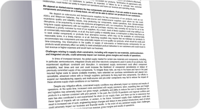 Table of Contents currently or in the future. Concerns over competitive matters or intellectual property ownership could constrain the growth and development of these relationships or result in the termination of one or more relationships. If we fail to effectively manage and grow our network of distributors and installers, or properly monitor the quality and efficacy of their service delivery, our ability to sell our products and efficiently provide our services may be impacted, and our operating results may be harmed. Our future performance depends on our ability to effectively manage our relationships with our existing customers, as well as to attract additional customers that will be able to market and support our products effectively, especially in markets in which we have not previously distributed our products. Termination of agreements with current customers, failure by customers to perform as expected, or failure by us to cultivate new customer relationships, could hinder our ability to expand our operations and harm our revenue and operating results. We depend on limited-source suppliers for key components and products. If we are unable to source these components and products on a timely basis, we will not be able to deliver our products to our customers. We depend on sole-source and limited-source suppliers for key components of our products, such as our ASICs and lithium-ion batteries. Any of the sole-source and limited-source suppliers upon whom we rely could experience quality and reliability issues, stop producing our components, cease operations, face climate-related disruptions, or be acquired by, or enter into exclusive arrangements with, our competitors. We generally do not have long-term supply agreements with our suppliers, and our purchase volumes may currently be too low for us to be considered a priority customer by most of our suppliers. As a result, most of these suppliers could stop selling to us at commercially reasonable prices, or at all. Any such quality or reliability issue, or interruption or delay may force us to seek similar components or products from alternative sources, which may not be available on commercially reasonable terms, in a timely manner, or at all. Switching suppliers may require that we redesign our products to accommodate new components and may potentially require us to re-qualify our products, which would be costly and time-consuming. Any interruption in the quality or supply of sole-source or limited-source components for our products would adversely affect our ability to meet scheduled product deliveries to our customers and could result in lost revenue or higher expenses and would harm our business. Challenges relating to supply chain constraints, including with respect to raw materials, semiconductors and integrated circuits, could adversely impact our revenue, gross margins and results of operations. In times of increased demand, the global supply market for certain raw materials and components, including, in particular, semiconductors, integrated circuits and other electronic components used in some of our products, has experienced significant constraint and disruption. A constrained supply environment could affect component availability, lead times and cost and could increase the likelihood of unexpected cancellations or delays of previously committed supply of key components. To mitigate these risks, we may in the future and have in the past incurred higher costs to secure available inventory, have extended our purchase commitments and placed non- cancellable, advanced orders with or through suppliers, particularly for long lead time components. Our efforts to expand our manufacturing capacity and multi-source and pre-order components may fail to reduce the impact of these adverse supply chain conditions on our business. Despite any mitigation efforts, constrained supply conditions may adversely impact our revenue and results of operations. At the same time, increased costs associated with supply premiums, labor, expediting fees and freight and logistics may adversely impact our gross margin, profitability and ability to reduce the cost to manufacture our products in a manner consistent with prior periods. In the past, the COVID-19 pandemic and regional conflicts and wars has also contributed to and exacerbated the strain on our supply chain, and there can be no assurance that these types of impacts will not continue, or worsen, in the future. Increased supply chain challenges could also result in increased use of cash, engineering design changes and delays in new product introductions, each of which could adversely impact our business and financial results. In the event of any persistent supply chain challenges, these challenges would adversely impact our revenue, gross margins and results of operations. Enphase Energy, Inc. | 2023 Form 10-K | 22
