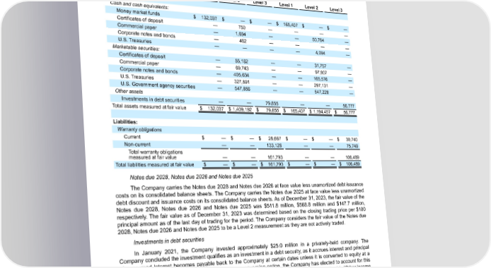 Table of Contents ENPHASE ENERGY, INC. NOTES TO CONSOLIDATED FINANCIAL STATEMENTS The following table presents assets and liabilities measured at fair value on a recurring basis using the above input categories: December 31, 2023 December 31, 2022 (In thousands) Level 1 Level 2 Level 3 Level 1 Level 2 Level 3 Assets: Cash and cash equivalents: Money market funds $ 132,037 $ — $ — $ 165,407 $ — $ — Certificates of deposit — 750 — — — — Commercial paper — 1,694 — — 50,764 — Corporate notes and bonds — 462 — — — — U.S. Treasuries — — — — 4,094 — Marketable securities: Certificates of deposit — 55,162 — — 31,757 — Commercial paper — 69,743 — — 97,907 — Corporate notes and bonds — 405,634 — — 165,576 — U.S. Treasuries — 327,891 — — 297,131 — U.S. Government agency securities — 547,856 — — 547,228 — Other assets Investments in debt securities — — 79,855 — — 56,777 Total assets measured at fair value $ 132,037 $ 1,409,192 $ 79,855 $ 165,407 $ 1,194,457 $ 56,777 Liabilities: Warranty obligations Current $ — $ — $ 28,667 $ — $ — $ 30,740 Non-current — — 133,126 — — 75,749 Total warranty obligations measured at fair value — — 161,793 — — 106,489 Total liabilities measured at fair value $ — $ — $ 161,793 $ — $ — $ 106,489 Notes due 2028, Notes due 2026 and Notes due 2025 The Company carries the Notes due 2028 and Notes due 2026 at face value less unamortized debt issuance costs on its consolidated balance sheets. The Company carries the Notes due 2025 at face value less unamortized debt discount and issuance costs on its consolidated balance sheets. As of December 31, 2023, the fair value of the Notes due 2028, Notes due 2026 and Notes due 2025 was $511.8 million, $568.8 million and $147.7 million, respectively. The fair value as of December 31, 2023 was determined based on the closing trading price per $100 principal amount as of the last day of trading for the period. The Company considers the fair value of the Notes due 2028, Notes due 2026 and Notes due 2025 to be a Level 2 measurement as they are not actively traded. Investments in debt securities In January 2021, the Company invested approximately $25.0 million in a privately-held company. The Company concluded the investment qualifies as an investment in a debt security, as it accrues interest and principal plus accrued interest becomes payable back to the Company at certain dates unless it is converted to equity at a pre-determined price. As the investment includes a conversion option, the Company has elected to account for this investment under the fair value option and any change in fair value of the investment is recognized in “Other income (expense), net” in the Company’s consolidated statement of operations for that period. Further, the Company has concluded that the Company’s investment in a debt security is considered to be a Level 3 measurement due to the use of significant unobservable inputs in the valuation model. The fair value was determined using discounted cash flow methodology and assumptions include implied yield and change in estimated term of investment being held-to- maturity. Enphase Energy, Inc. | 2023 Form 10-K | 97