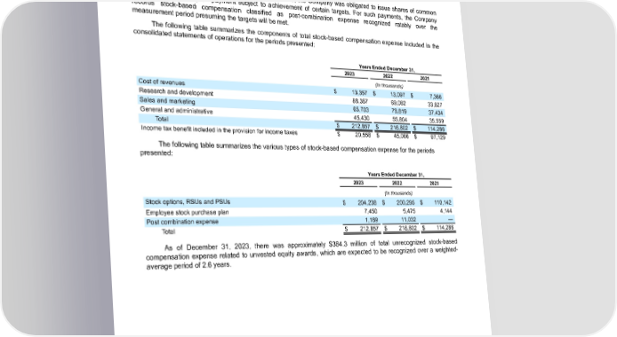Table of Contents ENPHASE ENERGY, INC. NOTES TO CONSOLIDATED FINANCIAL STATEMENTS Stock-based Compensation Expense Stock-based compensation expense for all stock-based awards, which includes shares purchased under the ESPP, RSUs and PSUs, expected to vest is measured at fair value on the date of grant and recognized ratably over the requisite service period. In addition, as part of certain business acquisitions, the Company was obligated to issue shares of common stock of the Company as payment subject to achievement of certain targets. For such payments, the Company records stock-based compensation classified as post-combination expense recognized ratably over the measurement period presuming the targets will be met. The following table summarizes the components of total stock-based compensation expense included in the consolidated statements of operations for the periods presented: Years Ended December 31, 2023 2022 2021 (In thousands) Cost of revenues $ 13,357 $ 13,097 $ 7,366 Research and development 88,367 69,082 33,927 Sales and marketing 65,703 78,819 37,434 General and administrative 45,430 55,804 35,559 Total $ 212,857 $ 216,802 $ 114,286 Income tax benefit included in the provision for income taxes $ 20,558 $ 45,066 $ 97,129 The following table summarizes the various types of stock-based compensation expense for the periods presented: Years Ended December 31, 2023 2022 2021 (In thousands) Stock options, RSUs and PSUs $ 204,238 $ 200,295 $ 110,142 Employee stock purchase plan 7,450 5,475 4,144 Post combination expense 1,169 11,032 — Total $ 212,857 $ 216,802 $ 114,286 As of December 31, 2023, there was approximately $384.3 million of total unrecognized stock-based compensation expense related to unvested equity awards, which are expected to be recognized over a weighted- average period of 2.6 years. Enphase Energy, Inc. | 2023 Form 10-K | 113