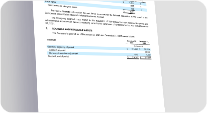 Table of Contents ENPHASE ENERGY, INC. NOTES TO CONSOLIDATED FINANCIAL STATEMENTS The following table shows the fair value of the separately identifiable intangible assets at the time of acquisition and the period over which each intangible asset will be amortized: Fair Value Useful Life (In thousands) (Years) Developed technology $ 6,900 5 Customer relationship 1,800 5 Trade name 500 5 Total identifiable intangible assets $ 9,200 Pro forma financial information has not been presented for the Sofdesk acquisition as the impact to the Company’s consolidated financial statements was not material. The Company incurred costs related to this acquisition of $2.0 million that were recorded in general and administrative expenses in the accompanying consolidated statements of operations for the year ended December 31, 2021. 7. GOODWILL AND INTANGIBLE ASSETS The Company’s goodwill as of December 31, 2023 and December 31, 2022 was as follows: December 31, December 31, Goodwill 2023 2022 (In thousands) Goodwill, beginning of period $ 213,559 $ 181,254 Goodwill acquired — 33,354 Currency translation adjustment 1,003 (1,049) Goodwill, end of period $ 214,562 $ 213,559 Enphase Energy, Inc. | 2023 Form 10-K | 92