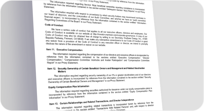 Table of Contents PART III Item 10. Directors, Executive Officers and Corporate Governance The information required regarding our directors is incorporated by reference from the information contained in the section entitled “Election of Directors” in our definitive Proxy Statement for the 2024 Annual Meeting of Stockholders (our “Proxy Statement”), a copy of which will be filed with the SEC on or before April 29, 2024. The information required regarding our executive officers is incorporated by reference from the information contained in the section entitled “Management” in our Proxy Statement. The information required regarding Section 16(a) beneficial ownership reporting compliance is incorporated by reference from the information contained in the section entitled “Delinquent Section 16(a) Reports” in our Proxy Statement. The information required with respect to procedures by which security holders may recommend nominees to our board of directors, and the composition of our Audit Committee, and whether we have an “audit committee financial expert,” is incorporated by reference from the information contained in the section entitled “Information Regarding Committees of the Board” in our Proxy Statement. Code of Conduct We have a written code of conduct that applies to all our executive officers, directors and employees. Our Code of Conduct is available on our website at http://investor.enphase.com/corporate-governance. A copy of our Code of Conduct may also be obtained free of charge by writing to our Secretary, Enphase Energy, Inc., 47281 Bayside Parkway, Fremont, CA 94538. If we make any substantive amendments to our Code of Conduct or grant any waiver from a provision of the Code of Conduct to any executive officer or director, we intend to promptly disclose the nature of the amendment or waiver on our website. Item 11. Executive Compensation The information required regarding the compensation of our directors and executive officers is incorporated by reference from the information contained in the sections entitled “Executive Compensation,” “Director Compensation,” “Compensation Committee Interlocks and Insider Participation” and “Compensation Committee Report” in our Proxy Statement. Item 12. Security Ownership of Certain Beneficial Owners and Management and Related Stockholder Matters The information required regarding security ownership of our 5% or greater stockholders and of our directors and executive officers is incorporated by reference from the information contained in the section entitled “Security Ownership of Certain Beneficial Owners and Management” in our Proxy Statement. Equity Compensation Plan Information The information required regarding securities authorized for issuance under our equity compensation plans is incorporated by reference from the information contained in the section entitled “Equity Compensation Plan Information” in our Proxy Statement. Item 13. Certain Relationships and Related Transactions, and Director Independence The information required regarding related transactions is incorporated herein by reference from the information contained in the section entitled “Transactions With Related Persons” and, with respect to director independence, the section entitled “Election of Directors” in our Proxy Statement. Item 14. Principal Accountant Fees and Services The information required is incorporated by reference from the information contained in the sections entitled “Principal Accountant Fees and Services” and “Pre-Approval Policies and Procedures” in the Proposal entitled “Ratification of Selection of Independent Registered Public Accounting Firm” in our Proxy Statement. Enphase Energy, Inc. | 2023 Form 10-K | 125