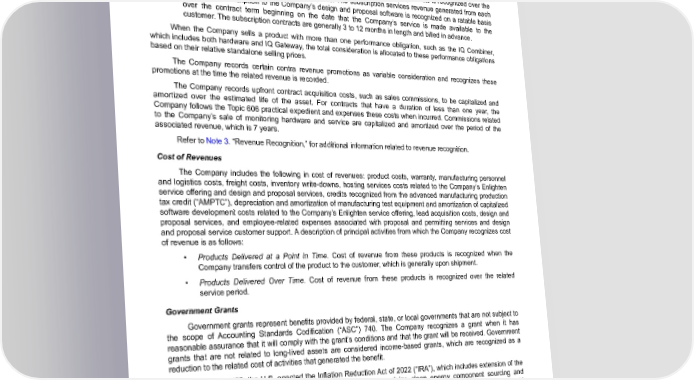 Table of Contents ENPHASE ENERGY, INC. NOTES TO CONSOLIDATED FINANCIAL STATEMENTS • Products Delivered Over Time. The sale of an IQ Gateway and IQ Energy Router includes the Company’s Enlighten cloud-based monitoring service. The full consideration for these products represents a single performance obligation and is deferred at the sale date and recognized over the estimated service period of 7 years. The Company also sells certain communication accessories that contain a service performance obligation to be delivered over time. The revenue from these products is recognized over the related service period, which is typically 5 years. The subscription services revenue generated from each customer’s subscription to the Company’s design and proposal software is recognized on a ratable basis over the contract term beginning on the date that the Company’s service is made available to the customer. The subscription contracts are generally 3 to 12 months in length and billed in advance. When the Company sells a product with more than one performance obligation, such as the IQ Combiner, which includes both hardware and IQ Gateway, the total consideration is allocated to these performance obligations based on their relative standalone selling prices. The Company records certain contra revenue promotions as variable consideration and recognizes these promotions at the time the related revenue is recorded. The Company records upfront contract acquisition costs, such as sales commissions, to be capitalized and amortized over the estimated life of the asset. For contracts that have a duration of less than one year, the Company follows the Topic 606 practical expedient and expenses these costs when incurred. Commissions related to the Company’s sale of monitoring hardware and service are capitalized and amortized over the period of the associated revenue, which is 7 years. Refer to Note 3. “Revenue Recognition,” for additional information related to revenue recognition. Cost of Revenues The Company includes the following in cost of revenues: product costs, warranty, manufacturing personnel and logistics costs, freight costs, inventory write-downs, hosting services costs related to the Company’s Enlighten service offering and design and proposal services, credits recognized from the advanced manufacturing production tax credit (“AMPTC”), depreciation and amortization of manufacturing test equipment and amortization of capitalized software development costs related to the Company’s Enlighten service offering, lead acquisition costs, design and proposal services, and employee-related expenses associated with proposal and permitting services and design and proposal service customer support. A description of principal activities from which the Company recognizes cost of revenue is as follows: • Products Delivered at a Point in Time. Cost of revenue from these products is recognized when the Company transfers control of the product to the customer, which is generally upon shipment. • Products Delivered Over Time. Cost of revenue from these products is recognized over the related service period. Government Grants Government grants represent benefits provided by federal, state, or local governments that are not subject to the scope of Accounting Standards Codification (“ASC”) 740. The Company recognizes a grant when it has reasonable assurance that it will comply with the grant’s conditions and that the grant will be received. Government grants that are not related to long-lived assets are considered income-based grants, which are recognized as a reduction to the related cost of activities that generated the benefit. In August 2022, the U.S. enacted the Inflation Reduction Act of 2022 (“IRA”), which includes extension of the investment tax credit as well as credits under AMPTC, to incentivize clean energy component sourcing and production, including for the production of microinverters. The IRA provides for an AMPTC on microinverters of 11 cents per alternating current watt basis. The AMPTC on microinverters decreases by 25% each year beginning in 2030 and ending after 2032. The Company recognized credits under AMPTC as a reduction to cost of revenues in the consolidated statement of operations for the microinverters manufactured in the United States and sold to customers during the year ended December 31, 2023. Such credit is also reflected as a reduction of income tax payable on the Company’s consolidated balance sheet within accrued liabilities. For the year ended December 31, 2023, benefits recognized from AMPTC of $53.5 million were recorded as a reduction to income tax payable Enphase Energy, Inc. | 2023 Form 10-K | 76