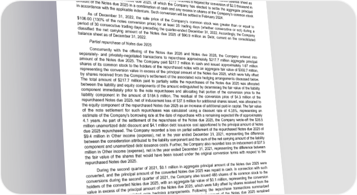Table of Contents ENPHASE ENERGY, INC. NOTES TO CONSOLIDATED FINANCIAL STATEMENTS As of December 31, 2023 the sale price of the Company’s common stock was not greater than or equal to $106.00 (130% of the notes conversion price) for at least 20 trading days (whether consecutive or not) during a period of 30 consecutive trading days preceding the quarter-ended December 31, 2023. As a result, the Notes due 2025 are not convertible at the holders’ option through March 31, 2024. Accordingly, the Company classified the net carrying amount of the Notes due 2025 of $96.0 million as Debt, non-current on the consolidated balance sheet as of December 31, 2023. On December 29, 2023, the Company received a request for conversion of $2.0 thousand in the principal amount of the Notes due 2025, of which the Company has elected to settle the aggregate principal amount of the Notes due 2025 in a combination of cash and any excess in shares of the Company’s common stock in accordance with the applicable indenture. Such conversion will be settled in February 2024. As of December 31, 2022, the sale price of the Company’s common stock was greater than or equal to $106.00 (130% of the notes conversion price) for at least 20 trading days (whether consecutive or not) during a period of 30 consecutive trading days preceding the quarter-ended December 31, 2022. Accordingly, the Company classified the net carrying amount of the Notes due 2025 of $90.9 million as Debt, current on the consolidated balance sheet as of December 31, 2022. Partial repurchase of Notes due 2025 Concurrently with the offering of the Notes due 2026 and Notes due 2028, the Company entered into separately- and privately-negotiated transactions to repurchase approximately $217.7 million aggregate principal amount of the Notes due 2025. The Company paid $217.7 million in cash and issued approximately 1.67 million shares of its common stock to the holders of the repurchased notes with an aggregate fair value of $302.7 million, representing the conversion value in excess of the principal amount of the Notes due 2025, which were fully offset by shares received from the Company’s settlement of the associated note hedging arrangements discussed below. The total amount of $217.7 million paid to partially settle the repurchases of the Notes due 2025 was allocated between the liability and equity components of the amount extinguished by determining the fair value of the liability component immediately prior to the note repurchases and allocating that portion of the conversion price to the liability component in the amount of $184.5 million. The residual of the conversion price of $4.3 million of the repurchased Notes due 2025, net of inducement loss of $37.5 million for additional shares issued, was allocated to the equity component of the repurchased Notes due 2025 as an increase of additional paid-in capital. The fair value of the note settlement for such repurchases was calculated using a discount rate of 4.35%, representing an estimate of the Company's borrowing rate at the date of repurchase with a remaining expected life of approximately 4.1 years. As part of the settlement of the repurchase of the Notes due 2025, the Company wrote-off the $38.5 million unamortized debt discount and $4.1 million debt issuance cost apportioned to the principal amount of Notes due 2025 repurchased. The Company recorded a loss on partial settlement of the repurchased Notes due 2025 of $9.4 million in Other income (expense), net in the year ended December 31, 2021, representing the difference between the consideration attributed to the liability component and the sum of the net carrying amount of the liability component and unamortized debt issuance costs. Further, the Company also recorded loss on inducement of $37.5 million in Other income (expense), net in the year ended December 31, 2021, representing the difference between the fair value of the shares that would have been issued under the original conversion terms with respect to the repurchased Notes due 2025. During the second quarter of 2021, $0.1 million in aggregate principal amount of the Notes due 2025 were converted, and the principal amount of the converted Notes due 2025 was repaid in cash. In connection with such conversions during the second quarter of 2021, the Company also issued 485 shares of its common stock to the holders of the converted Notes due 2025, with an aggregate fair value of $0.1 million, representing the conversion value in excess of the principal amount of the Notes due 2025, which were fully offset by shares received from the settlements of the associated note hedging arrangements. Following the repurchase transactions summarized above, as of December 31, 2023, $102.2 million aggregate principal amount of the Notes due 2025 remained outstanding. The derived effective interest rate on the Notes due 2025 host contract was determined to be 5.18%, which remains unchanged from the date of issuance. The remaining unamortized debt discount was $5.6 million as of December 31, 2023, and will be amortized over approximately 1.2 years from December 31, 2023. Enphase Energy, Inc. | 2023 Form 10-K | 107