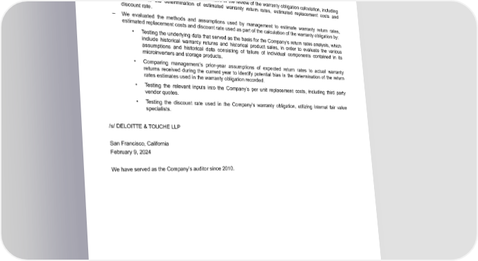 Table of Contents required in evaluating discount rates, performing audit procedures to evaluate whether the expected return rates, replacement costs and discount rate were appropriately determined as of December 31, 2023, required a high degree of auditor judgment and an increased extent of effort. How the Critical Audit Matter Was Addressed in the Audit Our audit procedures related to the estimated warranty return rates, estimated replacement costs and discount rate used in determining the warranty obligation included the following, among others: – We tested the effectiveness of controls utilized in the review of the warranty obligation calculation, including controls over the determination of estimated warranty return rates, estimated replacement costs and discount rate. – We evaluated the methods and assumptions used by management to estimate warranty return rates, estimated replacement costs and discount rate used as part of the calculation of the warranty obligation by: • Testing the underlying data that served as the basis for the Company’s return rates analysis, which include historical warranty returns and historical product sales, in order to evaluate the various assumptions and historical data consisting of failure of individual components contained in its microinverters and storage products. • Comparing management’s prior-year assumptions of expected return rates to actual warranty returns received during the current year to identify potential bias in the determination of the return rates estimates used in the warranty obligation recorded. • Testing the relevant inputs into the Company’s per unit replacement costs, including third party vendor quotes. • Testing the discount rate used in the Company’s warranty obligation, utilizing internal fair value specialists. /s/ DELOITTE & TOUCHE LLP San Francisco, California February 9, 2024 We have served as the Company’s auditor since 2010. Enphase Energy, Inc. | 2023 Form 10-K | 66