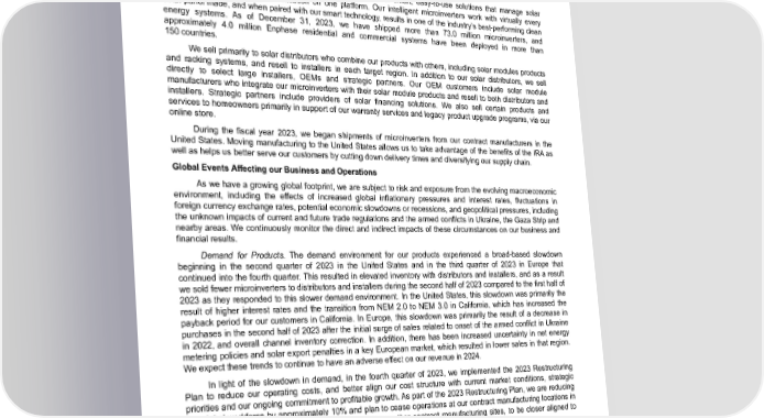Table of Contents Item 7. Management’s Discussion and Analysis of Financial Condition and Results of Operations The following section generally discusses 2023 results compared to 2022 results. Discussion of 2022 results compared to 2021 results to the extent not included in this report can be found in Part II, Item 7 of our Annual Report on Form 10-K for the year ended December 31, 2022. Business Overview and 2023 Highlights We are a global energy technology company. We deliver smart, easy-to-use solutions that manage solar generation, storage and communication on one platform. Our intelligent microinverters work with virtually every solar panel made, and when paired with our smart technology, results in one of the industry’s best-performing clean energy systems. As of December 31, 2023, we have shipped more than 73.0 million microinverters, and approximately 4.0 million Enphase residential and commercial systems have been deployed in more than 150 countries. We sell primarily to solar distributors who combine our products with others, including solar modules products and racking systems, and resell to installers in each target region. In addition to our solar distributors, we sell directly to select large installers, OEMs and strategic partners. Our OEM customers include solar module manufacturers who integrate our microinverters with their solar module products and resell to both distributors and installers. Strategic partners include providers of solar financing solutions. We also sell certain products and services to homeowners primarily in support of our warranty services and legacy product upgrade programs, via our online store. During the fiscal year 2023, we began shipments of microinverters from our contract manufacturers in the United States. Moving manufacturing to the United States allows us to take advantage of the benefits of the IRA as well as helps us better serve our customers by cutting down delivery times and diversifying our supply chain. Global Events Affecting our Business and Operations As we have a growing global footprint, we are subject to risk and exposure from the evolving macroeconomic environment, including the effects of increased global inflationary pressures and interest rates, fluctuations in foreign currency exchange rates, potential economic slowdowns or recessions, and geopolitical pressures, including the unknown impacts of current and future trade regulations and the armed conflicts in Ukraine, the Gaza Strip and nearby areas. We continuously monitor the direct and indirect impacts of these circumstances on our business and financial results. Demand for Products. The demand environment for our products experienced a broad-based slowdown beginning in the second quarter of 2023 in the United States and in the third quarter of 2023 in Europe that continued into the fourth quarter. This resulted in elevated inventory with distributors and installers, and as a result we sold fewer microinverters to distributors and installers during the second half of 2023 compared to the first half of 2023 as they responded to this slower demand environment. In the United States, this slowdown was primarily the result of higher interest rates and the transition from NEM 2.0 to NEM 3.0 in California, which has increased the payback period for our customers in California. In Europe, this slowdown was primarily the result of a decrease in purchases in the second half of 2023 after the initial surge of sales related to onset of the armed conflict in Ukraine in 2022, and overall channel inventory correction. In addition, there has been increased uncertainty in net energy metering policies and solar export penalties in a key European market, which resulted in lower sales in that region. We expect these trends to continue to have an adverse effect on our revenue in 2024. In light of the slowdown in demand, in the fourth quarter of 2023, we implemented the 2023 Restructuring Plan to reduce our operating costs, and better align our cost structure with current market conditions, strategic priorities and our ongoing commitment to profitable growth. As part of the 2023 Restructuring Plan, we are reducing our global workforce by approximately 10% and plan to cease operations at our contract manufacturing locations in Romania and Wisconsin, United States, and resize our other contract manufacturing sites, to be closer aligned to expected demand. Inflation Reduction Act of 2022. In August 2022, the IRA was enacted, which includes extension of the ITC as well as the AMPTC to incentivize clean energy component sourcing and production of microinverters. The IRA also included an additional 10% ITC for solar system components that are manufactured with a minimum threshold of domestic content. The IRA provides an AMPTC on microinverters of 11 cents per alternating current watt, which had a favorable impact to our results of operations in the year ended December 31, 2023. The AMPTC for microinverters decreases by 25% each year beginning in 2030 and ending after 2032. Under the IRA, the ITC was Enphase Energy, Inc. | 2023 Form 10-K | 49