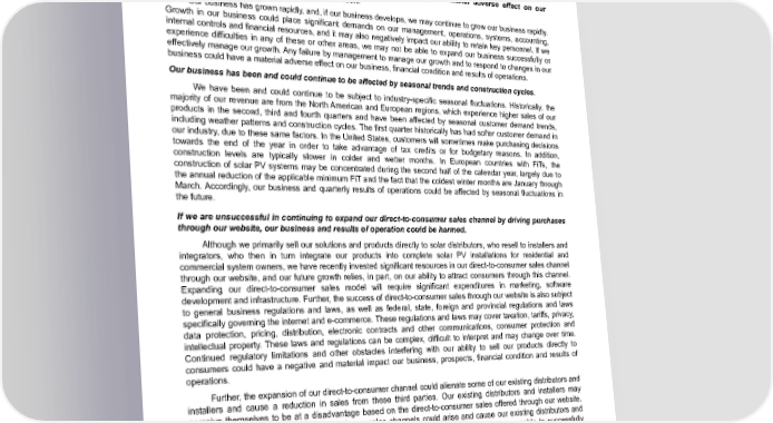 Table of Contents realize operating synergies, meet our strategic priorities and profitability objectives, or to reflect more closely changes in our business needs. These changes could be disruptive to our business, including our research and development efforts, and could result in significant expense, including accounting charges for inventory and technology-related write-offs, workforce reduction costs and charges relating to consolidation of excess facilities. Substantial expense or charges resulting from restructuring activities could adversely affect our results of operations and use of cash in those periods in which we undertake such actions. Any failure by management to properly manage growth could have a material adverse effect on our business, operating results and financial condition. Our business has grown rapidly, and, if our business develops, we may continue to grow our business rapidly. Growth in our business could place significant demands on our management, operations, systems, accounting, internal controls and financial resources, and it may also negatively impact our ability to retain key personnel. If we experience difficulties in any of these or other areas, we may not be able to expand our business successfully or effectively manage our growth. Any failure by management to manage our growth and to respond to changes in our business could have a material adverse effect on our business, financial condition and results of operations. Our business has been and could continue to be affected by seasonal trends and construction cycles. We have been and could continue to be subject to industry-specific seasonal fluctuations. Historically, the majority of our revenue are from the North American and European regions, which experience higher sales of our products in the second, third and fourth quarters and have been affected by seasonal customer demand trends, including weather patterns and construction cycles. The first quarter historically has had softer customer demand in our industry, due to these same factors. In the United States, customers will sometimes make purchasing decisions towards the end of the year in order to take advantage of tax credits or for budgetary reasons. In addition, construction levels are typically slower in colder and wetter months. In European countries with FiTs, the construction of solar PV systems may be concentrated during the second half of the calendar year, largely due to the annual reduction of the applicable minimum FiT and the fact that the coldest winter months are January through March. Accordingly, our business and quarterly results of operations could be affected by seasonal fluctuations in the future. If we are unsuccessful in continuing to expand our direct-to-consumer sales channel by driving purchases through our website, our business and results of operation could be harmed. Although we primarily sell our solutions and products directly to solar distributors, who resell to installers and integrators, who then in turn integrate our products into complete solar PV installations for residential and commercial system owners, we have recently invested significant resources in our direct-to-consumer sales channel through our website, and our future growth relies, in part, on our ability to attract consumers through this channel. Expanding our direct-to-consumer sales model will require significant expenditures in marketing, software development and infrastructure. Further, the success of direct-to-consumer sales through our website is also subject to general business regulations and laws, as well as federal, state, foreign and provincial regulations and laws specifically governing the internet and e-commerce. These regulations and laws may cover taxation, tariffs, privacy, data protection, pricing, distribution, electronic contracts and other communications, consumer protection and intellectual property. These laws and regulations can be complex, difficult to interpret and may change over time. Continued regulatory limitations and other obstacles interfering with our ability to sell our products directly to consumers could have a negative and material impact our business, prospects, financial condition and results of operations. Further, the expansion of our direct-to-consumer channel could alienate some of our existing distributors and installers and cause a reduction in sales from these third parties. Our existing distributors and installers may perceive themselves to be at a disadvantage based on the direct-to-consumer sales offered through our website. Due to these and other factors, conflicts in our sales channels could arise and cause our existing distributors and installers to divert resources away from the promotion and sale of our products. If we are unable to successfully continue to drive traffic to, and increase sales through, our website, our business and results of operations could be harmed. Enphase Energy, Inc. | 2023 Form 10-K | 26