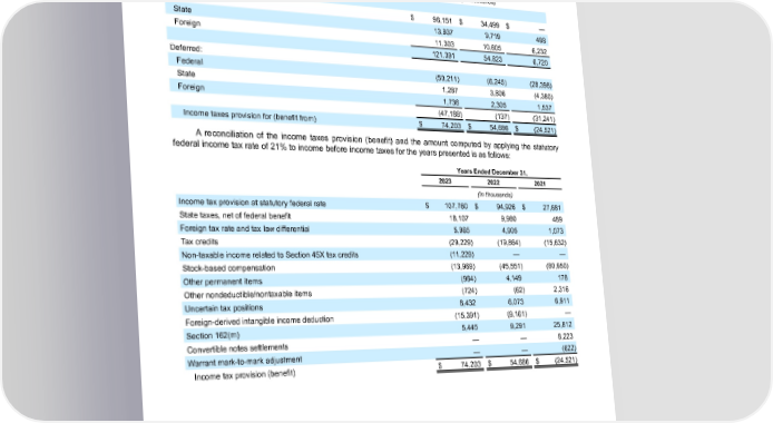 Table of Contents ENPHASE ENERGY, INC. NOTES TO CONSOLIDATED FINANCIAL STATEMENTS The income taxes provision for (benefit from) the years presented is as follows: Years Ended December 31, 2023 2022 2021 (In thousands) Current: Federal $ 96,151 $ 34,499 $ — State 13,937 9,719 488 Foreign 11,303 10,605 6,232 121,391 54,823 6,720 Deferred: Federal (50,211) (6,245) (28,398) State 1,287 3,806 (4,380) Foreign 1,736 2,305 1,537 (47,188) (137) (31,241) Income taxes provision for (benefit from) $ 74,203 $ 54,686 $ (24,521) A reconciliation of the income taxes provision (benefit) and the amount computed by applying the statutory federal income tax rate of 21% to income before income taxes for the years presented is as follows: Years Ended December 31, 2023 2022 2021 (In thousands) Income tax provision at statutory federal rate $ 107,760 $ 94,926 $ 27,681 State taxes, net of federal benefit 18,107 9,980 489 Foreign tax rate and tax law differential 5,965 4,905 1,073 Tax credits (29,229) (19,864) (15,632) Non-taxable income related to Section 45X tax credits (11,229) — — Stock-based compensation (13,969) (45,551) (80,950) Other permanent items (964) 4,149 178 Other nondeductible/nontaxable items (724) (62) 2,316 Uncertain tax positions 8,432 6,073 6,911 Foreign-derived intangible income deduction (15,391) (9,161) — Section 162(m) 5,445 9,291 25,812 Convertible notes settlements — — 8,223 Warrant mark-to-mark adjustment — — (622) Income tax provision (benefit) $ 74,203 $ 54,686 $ (24,521) Enphase Energy, Inc. | 2023 Form 10-K | 117