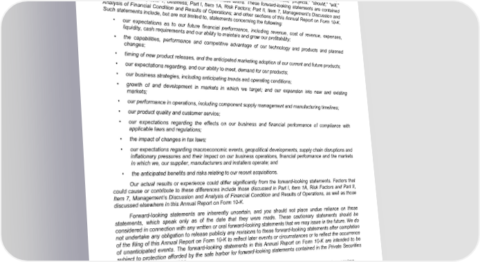 Table of Contents Cautionary Note Regarding Forward-Looking Statements This Annual Report on Form 10-K contains “forward-looking” statements within the meaning of Section 27A of the Securities Act of 1933, as amended (the “Securities Act”), and Section 21E of the Securities Exchange Act of 1934, as amended (the “Exchange Act”), about us and our industry that involve substantial risks and uncertainties. All statements other than statements of historical facts in this Annual Report on the Form 10-K are forward-looking statements. In some cases, forward-looking statements can be identified by terms such as “anticipates,” “believes,” “could,” “seeks,” “estimates,” “expects,” “intends,” “may,” “plans,” “potential,” “predicts, “projects,” “should,” “will,” “would” or similar expressions and the negatives of those terms. These forward-looking statements are contained principally in Part I, Item 1, Business; Part I, Item 1A, Risk Factors; Part II, Item 7, Management’s Discussion and Analysis of Financial Condition and Results of Operations; and other sections of this Annual Report on Form 10-K. Such statements include, but are not limited to, statements concerning the following: • our expectations as to our future financial performance, including revenue, cost of revenue, expenses, liquidity, cash requirements and our ability to maintain and grow our profitability; • the capabilities, performance and competitive advantage of our technology and products and planned changes; • timing of new product releases, and the anticipated marketing adoption of our current and future products; • our expectations regarding, and our ability to meet, demand for our products; • our business strategies, including anticipating trends and operating conditions; • growth of and development in markets in which we target; and our expansion into new and existing markets; • our performance in operations, including component supply management and manufacturing timelines; • our product quality and customer service; • our expectations regarding the effects on our business and financial performance of compliance with applicable laws and regulations; • the impact of changes in tax laws; • our expectations regarding macroeconomic events, geopolitical developments, supply chain disruptions and inflationary pressures and their impact on our business operations, financial performance and the markets in which we, our supplier, manufacturers and installers operate; and • the anticipated benefits and risks relating to our recent acquisitions. Our actual results or experience could differ significantly from the forward-looking statements. Factors that could cause or contribute to these differences include those discussed in Part I, Item 1A, Risk Factors and Part II, Item 7, Management’s Discussion and Analysis of Financial Condition and Results of Operations, as well as those discussed elsewhere in this Annual Report on Form 10-K. Forward-looking statements are inherently uncertain, and you should not place undue reliance on these statements, which speak only as of the date that they were made. These cautionary statements should be considered in connection with any written or oral forward-looking statements that we may issue in the future. We do not undertake any obligation to release publicly any revisions to these forward-looking statements after completion of the filing of this Annual Report on Form 10-K to reflect later events or circumstances or to reflect the occurrence of unanticipated events. The forward-looking statements in this Annual Report on Form 10-K are intended to be subject to protection afforded by the safe harbor for forward-looking statements contained in the Private Securities Litigation Reform Act of 1995. In this Annual Report on Form 10-K, unless otherwise indicated or the context otherwise requires, “Enphase Energy,” “Enphase,” “the Company,” “we,” “us,” and “our” refer to Enphase Energy, Inc., a Delaware corporation, and its subsidiaries. Enphase Energy, Inc. | 2023 Form 10-K | 4