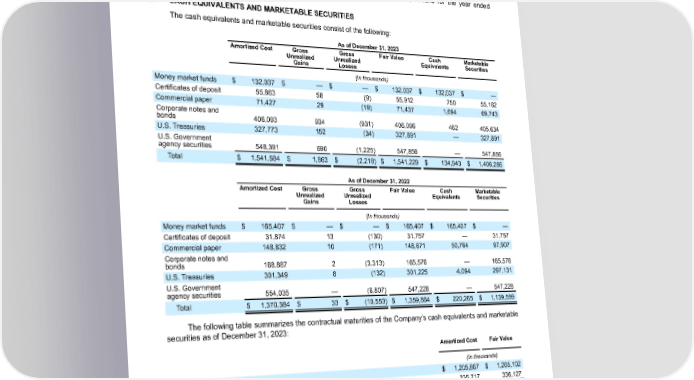 Table of Contents ENPHASE ENERGY, INC. NOTES TO CONSOLIDATED FINANCIAL STATEMENTS During the year ended December 31, 2023, the Company determined that a triggering event had occurred as a result of changes to the Company’s long-term projections and performed additional analysis on the valuation of the acquired customer relationship asset and concluded that the fair value was below its carrying amount. Accordingly, the Company recorded an impairment charge for the customer relationship asset of $3.8 million in “Restructuring and asset impairment charges” in the consolidated statement of operations for the year ended December 31, 2023. 8. CASH EQUIVALENTS AND MARKETABLE SECURITIES The cash equivalents and marketable securities consist of the following: As of December 31, 2023 Amortized Cost Gross Gross Fair Value Cash Marketable Unrealized Unrealized Equivalents Securities Gains Losses (In thousands) Money market funds $ 132,037 $ — $ — $ 132,037 $ 132,037 $ — Certificates of deposit 55,863 58 (9) 55,912 750 55,162 Commercial paper 71,427 29 (19) 71,437 1,694 69,743 Corporate notes and bonds 406,093 934 (931) 406,096 462 405,634 U.S. Treasuries 327,773 152 (34) 327,891 — 327,891 U.S. Government agency securities 548,391 690 (1,225) 547,856 — 547,856 Total $ 1,541,584 $ 1,863 $ (2,218) $ 1,541,229 $ 134,943 $ 1,406,286 As of December 31, 2022 Amortized Cost Gross Gross Fair Value Cash Marketable Unrealized Unrealized Equivalents Securities Gains Losses (In thousands) Money market funds $ 165,407 $ — $ — $ 165,407 $ 165,407 $ — Certificates of deposit 31,874 13 (130) 31,757 — 31,757 Commercial paper 148,832 10 (171) 148,671 50,764 97,907 Corporate notes and bonds 168,887 2 (3,313) 165,576 — 165,576 U.S. Treasuries 301,349 8 (132) 301,225 4,094 297,131 U.S. Government agency securities 554,035 — (6,807) 547,228 — 547,228 Total $ 1,370,384 $ 33 $ (10,553) $ 1,359,864 $ 220,265 $ 1,139,599 The following table summarizes the contractual maturities of the Company’s cash equivalents and marketable securities as of December 31, 2023: Amortized Cost Fair Value (In thousands) Due within one year $ 1,205,867 $ 1,205,102 Due within one to three years 335,717 336,127 Total $ 1,541,584 $ 1,541,229 All available-for-sale securities have been classified as current, based on management's intent and ability to use the funds in current operations. Enphase Energy, Inc. | 2023 Form 10-K | 94