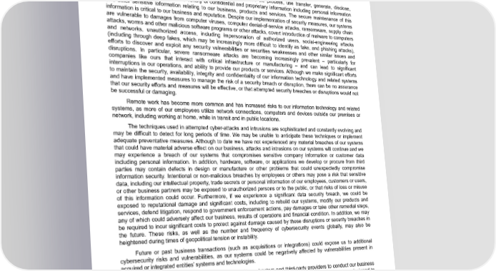Table of Contents Risks Related to our Intellectual Property and Technology We are dependent on information technology systems, infrastructure and data. We or third parties upon which we rely could be subject to breaches of our information technology systems caused by system security risks, failure of our data protection, cyber-attacks and erroneous or non-malicious actions or failures to act by our employees or others with authorized access to our networks, which could cause significant reputational, legal and financial damages. Like many companies, in the ordinary course of business we process, use transfer, generate, disclose, secure, transmit and store a wide variety of confidential and proprietary information including personal information and other sensitive information relating to our business, products and services. The secure maintenance of this information is critical to our business and reputation. Despite our implementation of security measures, our systems are vulnerable to damages from computer viruses, computer denial-of-service attacks, ransomware, supply chain attacks, worms and other malicious software programs or other attacks, covert introduction of malware to computers and networks, unauthorized access, including impersonation of authorized users, social-engineering attacks (including through deep fakes, which may be increasingly more difficult to identify as fake, and phishing attacks), efforts to discover and exploit any security vulnerabilities or securities weaknesses and other similar issues and disruptions. In particular, severe ransomware attacks are becoming increasingly prevalent – particularly for companies like ours that interact with critical infrastructure or manufacturing – and can lead to significant interruptions in our operations, and ability to provide our products or services. Although we make significant efforts to maintain the security, availability, integrity and confidentiality of our information technology and related systems and have implemented measures to manage the risk of a security breach or disruption, there can be no assurance that our security efforts and measures will be effective, or that attempted security breaches or disruptions would not be successful or damaging. Remote work has become more common and has increased risks to our information technology and related systems, as more of our employees utilize network connections, computers and devices outside our premises or network, including working at home, while in transit and in public locations. The techniques used in attempted cyber-attacks and intrusions are sophisticated and constantly evolving and may be difficult to detect for long periods of time. We may be unable to anticipate these techniques or implement adequate preventative measures. Although to date we have not experienced any material breaches of our systems that could have material adverse effect on our business, attacks and intrusions on our systems will continue and we may experience a breach of our systems that compromises sensitive company information or customer data including personal information. In addition, hardware, software, or applications we develop or procure from third parties may contain defects in design or manufacture or other problems that could unexpectedly compromise information security. Intentional or non-malicious breaches by employees or others may pose a risk that sensitive data, including our intellectual property, trade secrets or personal information of our employees, customers or users, or other business partners may be exposed to unauthorized persons or to the public, or that risks of loss or misuse of this information could occur. Furthermore, if we experience a significant data security breach, we could be exposed to reputational damage and significant costs, including to rebuild our systems, modify our products and services, defend litigation, respond to government enforcement actions, pay damages or take other remedial steps, any of which could adversely affect our business, results of operations and financial condition. In addition, we may be required to incur significant costs to protect against damage caused by these disruptions or security breaches in the future. These risks, as well as the number and frequency of cybersecurity events globally, may also be heightened during times of geopolitical tension or instability. Future or past business transactions (such as acquisitions or integrations) could expose us to additional cybersecurity risks and vulnerabilities, as our systems could be negatively affected by vulnerabilities present in acquired or integrated entities’ systems and technologies. We may also rely on and share information with contractors and third-party providers to conduct our business and provide our products and services. Although such contractors and third-party providers take steps designed to secure data and prevent security incidents, our ability to monitor these third-parties’ information security practices and potential security incidents is limited, and these third-parties may not have adequate information security measures in place. These third-party providers may experience a significant data security breach, which may also detrimentally affect our business, ability to provide our products and services, results of operations and financial condition. Enphase Energy, Inc. | 2023 Form 10-K | 27