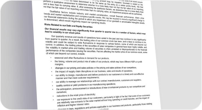 Table of Contents An impairment in the carrying value of goodwill or other intangible and long-lived assets could negatively affect our operating results. We record goodwill from the purchase consideration paid in excess of the fair value of the net assets recorded in connection with a business acquisition. We may not realize all the economic benefit from our business acquisitions, which could result in an impairment of goodwill or intangible assets. As of December 31, 2023, goodwill and intangible assets, net were approximately $214.6 million and $68.5 million, respectively. We test goodwill for impairment at least annually during the fourth quarter of each fiscal year or between annual tests if an event occurs or circumstances change that would indicate the carrying amount may be impaired. Goodwill is tested at the reporting unit level, which we have determined to be the same as the entity as a whole (entity level). We first perform a qualitative assessment to determine whether it is more likely than not that the fair value of our reporting unit is less than its carrying value. If, after assessing the qualitative factors, we determine that it is more likely than not that the fair value of our reporting unit is less than it’s carrying value, an impairment analysis will be performed. Qualitative factors include industry and market consideration, overall financial performance, share price trends and market capitalization and company-specific events. We may be required to record a significant charge in our financial statements during the period in which any impairment of our goodwill or amortizable intangible assets is determined, which would negatively impact our operating results. Risks Related to our Debt and Equity Securities Our financial results may vary significantly from quarter to quarter due to a number of factors, which may lead to volatility in our stock price. Our quarterly revenue and results of operations have varied in the past and may continue to vary significantly from quarter to quarter. As a result, the trading price of our common stock has been, and is likely to continue to be, volatile and could be subject to wide fluctuations in response to various factors, some of which are beyond our control. In addition, the trading prices of the securities of solar companies in general have been highly volatile, and the volatility in market price and trading volume of securities is often unrelated or disproportionate to the financial performance of the companies issuing the securities. Factors affecting the market price of our common stock, some of which are beyond our control, include: • seasonal and other fluctuations in demand for our products; • the timing, volume and product mix of sales of our products, which may have different ASPs or profit margins; • changes in our pricing and sales policies or the pricing and sales policies of our competitors; • the impact of supply chain disruptions on our business, sales and results of operations; • our ability to design, manufacture and deliver products to our customers in a timely and cost-effective manner and that meet customer requirements; • our ability to manage our relationships with our contract manufacturers, customers and suppliers; • quality control or yield problems in our manufacturing operations; • the anticipation, announcement or introductions of new or enhanced products by our competitors and ourselves; • reductions in the retail price of electricity; • our exposure to the credit risks of our customers, particularly in light of the fact that some of our customers are relatively new entrants to the solar market without long operating or credit histories, and the impact of inflation and higher interest rates; • changes in laws, regulations and policies applicable to our business and products, particularly those relating to government incentives for solar energy applications; • the impact of tariffs on the solar industry in general and our products in particular; • the amount and timing of operating costs and capital expenditures related to the maintenance and expansion of our business operations; • the impact of government-sponsored programs on our customers; • our ability to estimate future warranty obligations due to product failure rates, claim rates or replacement costs; • our ability to forecast our customer demand and manufacturing requirements, and manage our inventory; Enphase Energy, Inc. | 2023 Form 10-K | 39