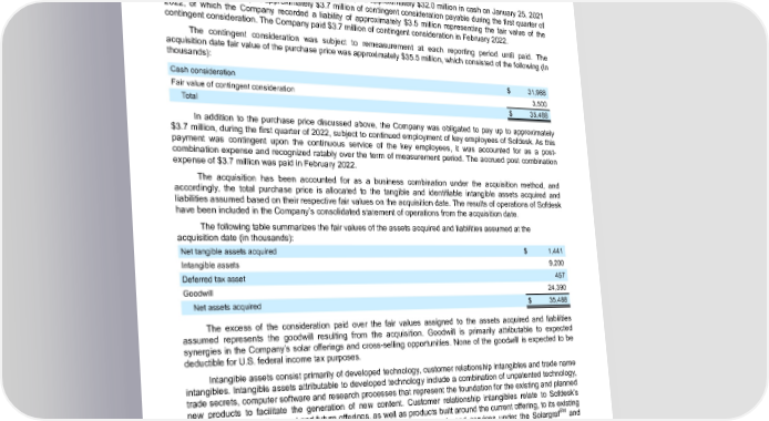 Table of Contents ENPHASE ENERGY, INC. NOTES TO CONSOLIDATED FINANCIAL STATEMENTS Acquisition of Sofdesk Inc. (“Sofdesk”) On January 25, 2021, the Company completed the acquisition of Sofdesk, a privately-held company. Sofdesk provides design tools and services software for residential solar installers and roofing companies and was acquired to enhance the Company’s digital transformation efforts. As part of the purchase price, the Company (i) paid approximately $32.0 million in cash on January 25, 2021 and (ii) was liable for up to approximately $3.7 million of contingent consideration payable during the first quarter of 2022, of which the Company recorded a liability of approximately $3.5 million representing the fair value of the contingent consideration. The Company paid $3.7 million of contingent consideration in February 2022. The contingent consideration was subject to remeasurement at each reporting period until paid. The acquisition date fair value of the purchase price was approximately $35.5 million, which consisted of the following (in thousands): Cash consideration $ 31,988 Fair value of contingent consideration 3,500 Total $ 35,488 In addition to the purchase price discussed above, the Company was obligated to pay up to approximately $3.7 million, during the first quarter of 2022, subject to continued employment of key employees of Sofdesk. As this payment was contingent upon the continuous service of the key employees, it was accounted for as a post- combination expense and recognized ratably over the term of measurement period. The accrued post combination expense of $3.7 million was paid in February 2022. The acquisition has been accounted for as a business combination under the acquisition method, and accordingly, the total purchase price is allocated to the tangible and identifiable intangible assets acquired and liabilities assumed based on their respective fair values on the acquisition date. The results of operations of Sofdesk have been included in the Company’s consolidated statement of operations from the acquisition date. The following table summarizes the fair values of the assets acquired and liabilities assumed at the acquisition date (in thousands): Net tangible assets acquired $ 1,441 Intangible assets 9,200 Deferred tax asset 457 Goodwill 24,390 Net assets acquired $ 35,488 The excess of the consideration paid over the fair values assigned to the assets acquired and liabilities assumed represents the goodwill resulting from the acquisition. Goodwill is primarily attributable to expected synergies in the Company’s solar offerings and cross-selling opportunities. None of the goodwill is expected to be deductible for U.S. federal income tax purposes. Intangible assets consist primarily of developed technology, customer relationship intangibles and trade name intangibles. Intangible assets attributable to developed technology include a combination of unpatented technology, trade secrets, computer software and research processes that represent the foundation for the existing and planned new products to facilitate the generation of new content. Customer relationship intangibles relate to Sofdesk’s software ability to sell current and future offerings, as well as products built around the current offering, to its existing SM customers. Trade name intangibles are attributable to marketing goods and services under the Solargraf and SM Roofgraf brands. Enphase Energy, Inc. | 2023 Form 10-K | 91
