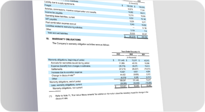 Table of Contents ENPHASE ENERGY, INC. NOTES TO CONSOLIDATED FINANCIAL STATEMENTS 9. ACCRUED LIABILITIES Accrued liabilities consist of the following: December 31, December 31, 2023 2022 (In thousands) Customer rebates and sales incentives $ 158,338 $ 153,916 Liability due to supply agreements 32,973 17,341 Freight 19,262 35,011 Salaries, commissions, incentive compensation and benefits 10,316 18,009 Income tax payable 8,531 16,146 Operating lease liabilities, current 5,220 5,371 VAT payable 3,243 19,852 Post combination expense accrual — 9,138 Liabilities related to restructuring activities 3,104 714 Other 20,932 20,441 Total accrued liabilities $ 261,919 $ 295,939 10. WARRANTY OBLIGATIONS The Company’s warranty obligation activities were as follows: Years Ended December 31, 2023 2022 2021 (In thousands) Warranty obligations, beginning of period $ 131,446 $ 73,377 $ 45,913 Accruals for warranties issued during period 51,866 48,703 18,098 Expense (benefit) from changes in estimates (19,176) 29,275 19,414 Settlements (27,216) (26,257) (15,073) Increase due to accretion expense 13,821 9,631 4,654 (1) Change in discount rate 44,422 (9,609) 2,512 Other (6,076) 6,326 (2,141) Warranty obligations, end of period 189,087 131,446 73,377 Less: warranty obligations, current (36,066) (35,556) (19,395) Warranty obligations, non-current $ 153,021 $ 95,890 $ 53,982 (1) Refer to Note 11, “Fair Value Measurements” for additional information about the monetary impact for change in the discount rate. Enphase Energy, Inc. | 2023 Form 10-K | 95
