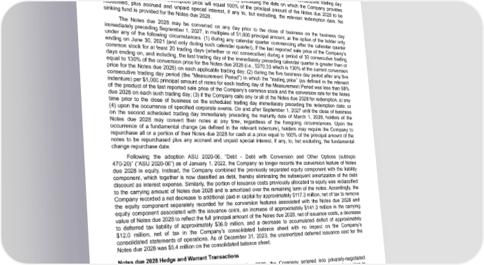 Table of Contents ENPHASE ENERGY, INC. NOTES TO CONSOLIDATED FINANCIAL STATEMENTS The Company may not redeem the Notes due 2028 prior to September 6, 2024. The Company may redeem for cash all or any portion of the Notes due 2028, at the Company’s election, on or after September 6, 2024, if the last reported sale price of the Company’s common stock has been greater than or equal to 130% of the conversion price then in effect for the Notes due 2028 (i.e., $370.33, which is 130% of the current conversion price for the Notes due 2028) for at least 20 trading days (whether or not consecutive) during any 30 consecutive trading day period ending on, and including, the trading day immediately preceding the date on which the Company provides notice of redemption. The redemption price will equal 100% of the principal amount of the Notes due 2028 to be redeemed, plus accrued and unpaid special interest, if any to, but excluding, the relevant redemption date. No sinking fund is provided for the Notes due 2028. The Notes due 2028 may be converted on any day prior to the close of business on the business day immediately preceding September 1, 2027, in multiples of $1,000 principal amount, at the option of the holder only under any of the following circumstances: (1) during any calendar quarter commencing after the calendar quarter ending on June 30, 2021 (and only during such calendar quarter), if the last reported sale price of the Company’s common stock for at least 20 trading days (whether or not consecutive) during a period of 30 consecutive trading days ending on, and including, the last trading day of the immediately preceding calendar quarter is greater than or equal to 130% of the conversion price for the Notes due 2028 (i.e., $370.33 which is 130% of the current conversion price for the Notes due 2028) on each applicable trading day; (2) during the five business day period after any five consecutive trading day period (the “Measurement Period”) in which the “trading price” (as defined in the relevant indenture) per $1,000 principal amount of notes for each trading day of the Measurement Period was less than 98% of the product of the last reported sale price of the Company’s common stock and the conversion rate for the Notes due 2028 on each such trading day; (3) if the Company calls any or all of the Notes due 2028 for redemption, at any time prior to the close of business on the scheduled trading day immediately preceding the redemption date; or (4) upon the occurrence of specified corporate events. On and after September 1, 2027 until the close of business on the second scheduled trading day immediately preceding the maturity date of March 1, 2028, holders of the Notes due 2028 may convert their notes at any time, regardless of the foregoing circumstances. Upon the occurrence of a fundamental change (as defined in the relevant indenture), holders may require the Company to repurchase all or a portion of their Notes due 2028 for cash at a price equal to 100% of the principal amount of the notes to be repurchased plus any accrued and unpaid special interest, if any, to, but excluding, the fundamental change repurchase date. Following the adoption ASU 2020-06, “Debt - Debt with Conversion and Other Options (subtopic 470-20)” (“ASU 2020-06”) as of January 1, 2022, the Company no longer records the conversion feature of Notes due 2028 in equity. Instead, the Company combined the previously separated equity component with the liability component, which together is now classified as debt, thereby eliminating the subsequent amortization of the debt discount as interest expense. Similarly, the portion of issuance costs previously allocated to equity was reclassified to the carrying amount of Notes due 2028 and is amortized over the remaining term of the notes. Accordingly, the Company recorded a net decrease to additional paid-in capital by approximately $117.3 million, net of tax to remove the equity component separately recorded for the conversion features associated with the Notes due 2028 and equity component associated with the issuance costs, an increase of approximately $141.3 million in the carrying value of Notes due 2028 to reflect the full principal amount of the Notes due 2028, net of issuance costs, a decrease to deferred tax liability of approximately $36.0 million, and a decrease to accumulated deficit of approximately $12.0 million, net of tax in the Company’s consolidated balance sheet with no impact on the Company’s consolidated statements of operations. As of December 31, 2023, the unamortized deferred issuance cost for the Notes due 2028 was $5.4 million on the consolidated balance sheet. Notes due 2028 Hedge and Warrant Transactions In connection with the offering of the Notes due 2028, the Company entered into privately-negotiated convertible note hedge transactions (“Notes due 2028 Hedge”) pursuant to which the Company has the option to purchase a total of approximately 2.0 million shares of its common stock (subject to anti-dilution adjustments), which is the same number of shares initially issuable upon conversion of the Notes due 2028, at a price of $284.87 per share, which is the initial conversion price of the Notes due 2028. The total cost of the convertible note hedge transactions was approximately $161.6 million. The convertible note hedge transactions are expected generally to reduce potential dilution to the Company’s common stock upon any conversion of the Notes due 2028 and/or offset any cash payments the Company is required to make in excess of the principal amount of converted notes, as the case may be. Enphase Energy, Inc. | 2023 Form 10-K | 103