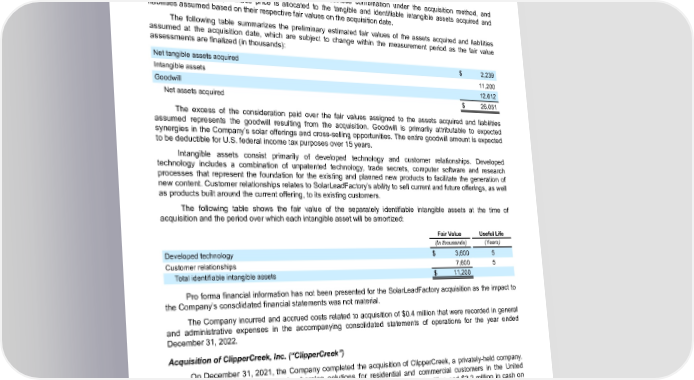 Table of Contents ENPHASE ENERGY, INC. NOTES TO CONSOLIDATED FINANCIAL STATEMENTS Acquisition of SolarLeadFactory, LLC. (“SolarLeadFactory”) On March 14, 2022, the Company completed the acquisition of SolarLeadFactory, a privately-held company. SolarLeadFactory provides high quality leads to solar installers. As part of the purchase price, the Company paid approximately $26.1 million in cash on March 14, 2022. The acquisition has been accounted for as a business combination under the acquisition method, and accordingly, the total purchase price is allocated to the tangible and identifiable intangible assets acquired and liabilities assumed based on their respective fair values on the acquisition date. The following table summarizes the preliminary estimated fair values of the assets acquired and liabilities assumed at the acquisition date, which are subject to change within the measurement period as the fair value assessments are finalized (in thousands): Net tangible assets acquired $ 2,239 Intangible assets 11,200 Goodwill 12,612 Net assets acquired $ 26,051 The excess of the consideration paid over the fair values assigned to the assets acquired and liabilities assumed represents the goodwill resulting from the acquisition. Goodwill is primarily attributable to expected synergies in the Company’s solar offerings and cross-selling opportunities. The entire goodwill amount is expected to be deductible for U.S. federal income tax purposes over 15 years. Intangible assets consist primarily of developed technology and customer relationships. Developed technology includes a combination of unpatented technology, trade secrets, computer software and research processes that represent the foundation for the existing and planned new products to facilitate the generation of new content. Customer relationships relates to SolarLeadFactory’s ability to sell current and future offerings, as well as products built around the current offering, to its existing customers. The following table shows the fair value of the separately identifiable intangible assets at the time of acquisition and the period over which each intangible asset will be amortized: Fair Value Useful Life (In thousands) (Years) Developed technology $ 3,600 5 Customer relationships 7,600 5 Total identifiable intangible assets $ 11,200 Pro forma financial information has not been presented for the SolarLeadFactory acquisition as the impact to the Company’s consolidated financial statements was not material. The Company incurred and accrued costs related to acquisition of $0.4 million that were recorded in general and administrative expenses in the accompanying consolidated statements of operations for the year ended December 31, 2022. Acquisition of ClipperCreek, Inc. (“ClipperCreek”) On December 31, 2021, the Company completed the acquisition of ClipperCreek, a privately-held company. ClipperCreek offers electric vehicle charging solutions for residential and commercial customers in the United States. As part of the purchase price, the Company paid approximately $113.1 million and $3.2 million in cash on December 31, 2021 and June 2, 2022, respectively. The acquisition has been accounted for as a business combination under the acquisition method, and accordingly, the total purchase price is allocated to the tangible and identifiable intangible assets acquired and liabilities assumed based on their respective fair values on the acquisition date. Enphase Energy, Inc. | 2023 Form 10-K | 87