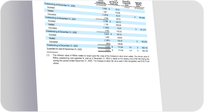 Table of Contents ENPHASE ENERGY, INC. NOTES TO CONSOLIDATED FINANCIAL STATEMENTS Restricted Stock Units The following table summarizes RSU activity: Weighted- Weighted- Average Average Number of Fair Value Remaining Aggregate Shares per Share at Contractual Intrinsic (1) Outstanding Grant Date Term Value (In thousands) (Years) (In thousands) Outstanding at December 31, 2020 3,588 $ 27.61 Granted 1,301 179.88 Vested (1,979) 20.47 $ 364,665 Canceled (124) 88.50 Outstanding at December 31, 2021 2,786 $ 100.73 Granted 1,159 228.88 Vested (1,500) 72.87 $ 321,274 Canceled (192) 150.02 Outstanding at December 31, 2022 2,253 $ 181.01 Granted 1,409 154.63 Vested (1,061) 152.47 $ 185,078 Canceled (269) 184.66 Outstanding at December 31, 2023 2,332 $ 177.64 1.4 $ 308,135 Expected to vest at December 31, 2023 2,331 $ 177.64 1.4 $ 308,126 (1) The intrinsic value of RSUs vested is based upon the value of the Company’s stock when vested. The intrinsic value of RSUs outstanding and expected to vest as of December 31, 2023 is based on the closing price of the last trading day during the period ended December 31, 2023. The Company’s stock fair value used in this computation was $132.14 per share. Enphase Energy, Inc. | 2023 Form 10-K | 115
