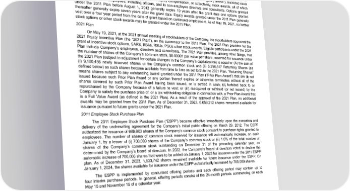 Table of Contents ENPHASE ENERGY, INC. NOTES TO CONSOLIDATED FINANCIAL STATEMENTS 16. STOCK-BASED COMPENSATION 2011 Plan Under the 2011 Equity Incentive Plan (the “2011 Plan”), the Company could initially issue up to 2,643,171 shares of its common stock pursuant to stock options, stock appreciation rights (“SARS”), restricted stock awards (“RSA”), RSUs, PSUs, and other forms of equity compensation, or collectively, stock awards, all of which may be granted to employees, including officers, and to non-employee directors and consultants. Options granted under the 2011 Plan before August 1, 2012 generally expire 10 years after the grant date and options granted thereafter generally expire seven years after the grant date. Equity awards granted under the 2011 Plan generally vest over a four year period from the date of grant based on continued employment. As of May 19, 2021, no further stock options or other stock awards may be granted under the 2011 Plan. 2021 Plan On May 19, 2021, at the 2021 annual meeting of stockholders of the Company, the stockholders approved the 2021 Equity Incentive Plan (the “2021 Plan”), as the successor to the 2011 Plan. The 2021 Plan provides for the grant of incentive stock options, SARS, RSAs, RSUs, PSUs other stock awards. Eligible participants under the 2021 Plan include Company’s employees, directors and consultants. The 2021 Plan provides, among other things, that the number of shares of the Company’s common stock, $0.00001 par value per share, reserved for issuance under the 2021 Plan (subject to adjustment for certain changes in the Company’s capitalization) is equal to: (A) the sum of (i) 9,100,456 newly reserved shares of the Company’s common stock and (ii) 5,256,517 Returning Shares (as defined below) as such shares become available from time to time as set forth in the 2021 Plan. “Returning Shares” means shares subject to any outstanding award granted under the 2011 Plan (“Prior Plan Award”) that are (i) not issued because such Prior Plan Award or any portion thereof expires or otherwise terminates without all of the shares covered by such Prior Plan Award having been issued, or is settled in cash; (ii) forfeited back to or repurchased by the Company because of a failure to vest; or (iii) reacquired or withheld (or not issued) by the Company to satisfy the purchase price of, or a tax withholding obligation in connection with, a Prior Plan Award that is a Full Value Award (as defined in the 2021 Plan). As a result of the approval of the 2021 Plan, no additional awards may be granted from the 2011 Plan. As of December 31, 2023, 6,059,212 shares remained available for issuance pursuant to future grants under the 2021 Plan. 2011 Employee Stock Purchase Plan The 2011 Employee Stock Purchase Plan (“ESPP”) became effective immediately upon the execution and delivery of the underwriting agreement for the Company’s initial public offering on March 29, 2012. The ESPP authorized the issuance of 669,603 shares of the Company’s common stock pursuant to purchase rights granted to employees. The number of shares of common stock reserved for issuance will automatically increase, on each January 1, by a lesser of (i) 700,000 shares of the Company’s common stock or (ii) 1.0% of the total number of shares of the Company’s common stock outstanding on December 31 of the preceding calendar year, as determined by the Company’s board of directors. In 2022, the Company’s board of directors voted to decline the automatic increase of 700,000 shares that were to be added on January 1, 2023 for issuance under the 2011 ESPP plan. As of December 31, 2023, 1,533,742 shares remained available for future issuance under the ESPP. On January 1, 2024, the shares available for issuance under the ESPP automatically increased by 700,000 shares. The ESPP is implemented by concurrent offering periods and each offering period may contain up to four interim purchase periods. In general, offering periods consist of the 24-month periods commencing on each May 15 and November 15 of a calendar year. Enphase Energy, Inc. | 2023 Form 10-K | 111