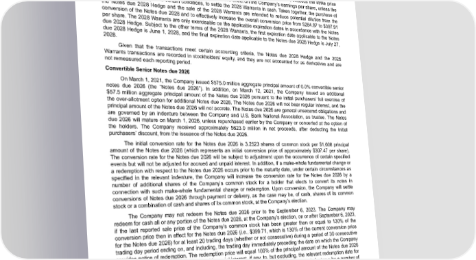Table of Contents ENPHASE ENERGY, INC. NOTES TO CONSOLIDATED FINANCIAL STATEMENTS Additionally, the Company separately entered into privately-negotiated warrant transactions (the “2028 Warrants”) whereby the Company sold warrants to acquire approximately 2.0 million shares of the Company’s common stock (subject to anti-dilution adjustments) at an initial strike price of $397.91 per share. The Company received aggregate proceeds of approximately $123.4 million from the sale of the 2028 Warrants. If the market value per share of the Company’s common stock, as measured under the 2028 Warrants, exceeds the strike price of the 2028 Warrants, the 2028 Warrants will have a dilutive effect on the Company’s earnings per share, unless the Company elects, subject to certain conditions, to settle the 2028 Warrants in cash. Taken together, the purchase of the Notes due 2028 Hedge and the sale of the 2028 Warrants are intended to reduce potential dilution from the conversion of the Notes due 2028 and to effectively increase the overall conversion price from $284.87 to $397.91 per share. The 2028 Warrants are only exercisable on the applicable expiration dates in accordance with the Notes due 2028 Hedge. Subject to the other terms of the 2028 Warrants, the first expiration date applicable to the Notes due 2028 Hedge is June 1, 2028, and the final expiration date applicable to the Notes due 2028 Hedge is July 27, 2028. Given that the transactions meet certain accounting criteria, the Notes due 2028 Hedge and the 2028 Warrants transactions are recorded in stockholders’ equity, and they are not accounted for as derivatives and are not remeasured each reporting period. Convertible Senior Notes due 2026 On March 1, 2021, the Company issued $575.0 million aggregate principal amount of 0.0% convertible senior notes due 2026 (the “Notes due 2026”). In addition, on March 12, 2021, the Company issued an additional $57.5 million aggregate principal amount of the Notes due 2026 pursuant to the initial purchasers’ full exercise of the over-allotment option for additional Notes due 2026. The Notes due 2026 will not bear regular interest, and the principal amount of the Notes due 2026 will not accrete. The Notes due 2026 are general unsecured obligations and are governed by an indenture between the Company and U.S. Bank National Association, as trustee. The Notes due 2026 will mature on March 1, 2026, unless repurchased earlier by the Company or converted at the option of the holders. The Company received approximately $623.0 million in net proceeds, after deducting the initial purchasers’ discount, from the issuance of the Notes due 2026. The initial conversion rate for the Notes due 2026 is 3.2523 shares of common stock per $1,000 principal amount of the Notes due 2026 (which represents an initial conversion price of approximately $307.47 per share). The conversion rate for the Notes due 2026 will be subject to adjustment upon the occurrence of certain specified events but will not be adjusted for accrued and unpaid interest. In addition, if a make-whole fundamental change or a redemption with respect to the Notes due 2026 occurs prior to the maturity date, under certain circumstances as specified in the relevant indenture, the Company will increase the conversion rate for the Notes due 2026 by a number of additional shares of the Company’s common stock for a holder that elects to convert its notes in connection with such make-whole fundamental change or redemption. Upon conversion, the Company will settle conversions of Notes due 2026 through payment or delivery, as the case may be, of cash, shares of its common stock or a combination of cash and shares of its common stock, at the Company’s election. The Company may not redeem the Notes due 2026 prior to the September 6, 2023. The Company may redeem for cash all or any portion of the Notes due 2026, at the Company’s election, on or after September 6, 2023, if the last reported sale price of the Company’s common stock has been greater than or equal to 130% of the conversion price then in effect for the Notes due 2026 (i.e., $399.71, which is 130% of the current conversion price for the Notes due 2026) for at least 20 trading days (whether or not consecutive) during a period of 30 consecutive trading day period ending on, and including, the trading day immediately preceding the date on which the Company provides notice of redemption. The redemption price will equal 100% of the principal amount of the Notes due 2026 to be redeemed, plus accrued and unpaid special interest, if any, to, but excluding, the relevant redemption date for the Notes due 2026. The redemption price will be increased as described in the relevant indentures by a number of additional shares of the Company in connection with such optional redemption by the Company. No sinking fund is provided for the Notes due 2026. The Notes due 2026 may be converted on any day prior to the close of business on the business day immediately preceding September 1, 2025, in multiples of $1,000 principal amount, at the option of the holder only under any of the following circumstances: (1) during any calendar quarter commencing after the calendar quarter ending on June 30, 2021 (and only during such calendar quarter), if the last reported sale price of the Company’s Enphase Energy, Inc. | 2023 Form 10-K | 104