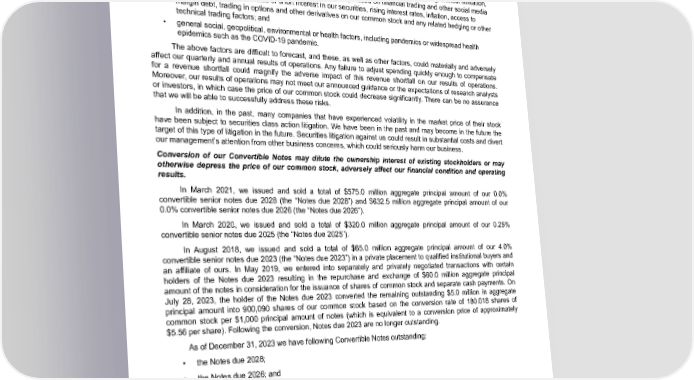 Table of Contents • fluctuations in foreign currency exchange rates; • announcement of acquisitions or dispositions of our assets or business operations; • issuances of our common stock or equity-linked securities such as the Convertible Notes; • changes in our management; • technical factors in the public trading market for our common stock that may produce price movements that may or may not comport to macro, industry or company-specific fundamentals, including, without limitation, the sentiment of retail investors (including as may be expressed on financial trading and other social media sites), the amount and status of short interest in our securities, rising interest rates, inflation, access to margin debt, trading in options and other derivatives on our common stock and any related hedging or other technical trading factors; and • general social, geopolitical, environmental or health factors, including pandemics or widespread health epidemics such as the COVID-19 pandemic. The above factors are difficult to forecast, and these, as well as other factors, could materially and adversely affect our quarterly and annual results of operations. Any failure to adjust spending quickly enough to compensate for a revenue shortfall could magnify the adverse impact of this revenue shortfall on our results of operations. Moreover, our results of operations may not meet our announced guidance or the expectations of research analysts or investors, in which case the price of our common stock could decrease significantly. There can be no assurance that we will be able to successfully address these risks. In addition, in the past, many companies that have experienced volatility in the market price of their stock have been subject to securities class action litigation. We have been in the past and may become in the future the target of this type of litigation in the future. Securities litigation against us could result in substantial costs and divert our management’s attention from other business concerns, which could seriously harm our business. Conversion of our Convertible Notes may dilute the ownership interest of existing stockholders or may otherwise depress the price of our common stock, adversely affect our financial condition and operating results. In March 2021, we issued and sold a total of $575.0 million aggregate principal amount of our 0.0% convertible senior notes due 2028 (the “Notes due 2028”) and $632.5 million aggregate principal amount of our 0.0% convertible senior notes due 2026 (the “Notes due 2026”). In March 2020, we issued and sold a total of $320.0 million aggregate principal amount of our 0.25% convertible senior notes due 2025 (the “Notes due 2025”). In August 2018, we issued and sold a total of $65.0 million aggregate principal amount of our 4.0% convertible senior notes due 2023 (the “Notes due 2023”) in a private placement to qualified institutional buyers and an affiliate of ours. In May 2019, we entered into separately and privately negotiated transactions with certain holders of the Notes due 2023 resulting in the repurchase and exchange of $60.0 million aggregate principal amount of the notes in consideration for the issuance of shares of common stock and separate cash payments. On July 28, 2023, the holder of the Notes due 2023 converted the remaining outstanding $5.0 million in aggregate principal amount into 900,090 shares of our common stock based on the conversion rate of 180.018 shares of common stock per $1,000 principal amount of notes (which is equivalent to a conversion price of approximately $5.56 per share). Following the conversion, Notes due 2023 are no longer outstanding. As of December 31, 2023 we have following Convertible Notes outstanding: • the Notes due 2028; • the Notes due 2026; and • the Notes due 2025. The conversion of some or all of the Convertible Notes may dilute the ownership interests of existing stockholders. Any sales in the public market of the common stock issuable upon such conversion could adversely affect prevailing market prices of our common stock. In addition, the existence of the Convertible Notes may encourage short selling by market participants because the conversion of the Convertible Notes could be used to satisfy short positions. In addition, the anticipated conversion of the Convertible Notes into shares of our common stock could depress the price of our common stock. Enphase Energy, Inc. | 2023 Form 10-K | 40