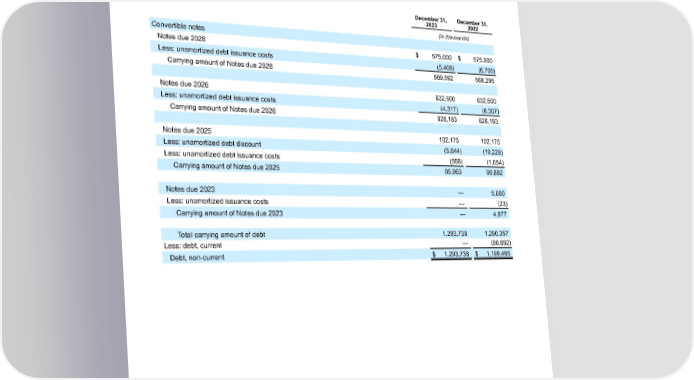 Table of Contents ENPHASE ENERGY, INC. NOTES TO CONSOLIDATED FINANCIAL STATEMENTS 13. DEBT The following table provides information regarding the Company’s debt: December 31, December 31, 2023 2022 (In thousands) Convertible notes Notes due 2028 $ 575,000 $ 575,000 Less: unamortized debt issuance costs (5,408) (6,705) Carrying amount of Notes due 2028 569,592 568,295 Notes due 2026 632,500 632,500 Less: unamortized debt issuance costs (4,317) (6,307) Carrying amount of Notes due 2026 628,183 626,193 Notes due 2025 102,175 102,175 Less: unamortized debt discount (5,644) (10,229) Less: unamortized debt issuance costs (568) (1,054) Carrying amount of Notes due 2025 95,963 90,892 Notes due 2023 — 5,000 Less: unamortized issuance costs — (23) Carrying amount of Notes due 2023 — 4,977 Total carrying amount of debt 1,293,738 1,290,357 Less: debt, current — (90,892) Debt, non-current $ 1,293,738 $ 1,199,465 Enphase Energy, Inc. | 2023 Form 10-K | 101