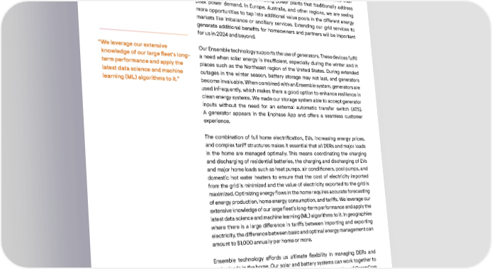 We are partnering with aggregators and utilities to enable grid services in “The introduction of HEMS software based forecasting and optimization logic of our HEMS solution to other geographies where such programs are oered. Grid services programs enable not only allows us to optimally product areas. We believe this AI-based logic will fuel all of our future product homeowners with IQ Batteries to participate by discharging their batteries, control equipment in the home, but releases and will signicantly dierentiate us in the market. This optimization thereby reducing their demand on the grid, and receive compensation also further extends the capability engine will be applied as well to support dynamic taris in dierent European in the form of incentives or rebates. As a result, utilities can reduce their of our systems to participate in grid markets as well as NEM 3.0 in California. dependency on expensive, polluting power plants that traditionally address services programs.” peak power demand. In Europe, Australia, and other regions, we are seeing The introduction of HEMS software not only allows us to optimally control more opportunities to tap into additional value pools in the dierent energy equipment in the home, but also further extends the capability of our systems markets like imbalance or ancillary services. Extending our grid services to to participate in grid services programs. Where most grid services programs generate additional benets for homeowners and partners will be important today only allow utilities to leverage specic resources in the home, HEMS for us in 2024 and beyond. software can provide a coordinated response to utility requests, creating a larger and more reliable participation for the utility and more incentive “We leverage our extensive Our Ensemble technology supports the use of generators. These devices fulll value with less disruption for the homeowner. We are laying the foundation knowledge of our large eet’s long- a need when solar energy is insucient, especially during the winter and in for becoming the intelligent site management behind the meter and being term performance and apply the places such as the Northeast region of the United States. During extended the technical aggregator across portfolios of sites. We will utilize our core latest data science and machine outages in the winter season, battery storage may not last, and generators strengths of having a deep understanding of the assets behind the meter and learning (ML) algorithms to it.” become invaluable. When combined with an Ensemble system, generators are our AI-based forecasting and optimization engine. used infrequently, which makes them a good option to enhance resilience in clean energy systems. We made our storage system able to accept generator We have discussed our strategy for all the AC-coupled elements of an Enphase inputs without the need for an external automatic transfer switch (ATS). home energy management system: microinverters, batteries, EV chargers, A generator appears in the Enphase App and oers a seamless customer generators, HEMS software, and grid services. experience. The combination of full home electrication, EVs, increasing energy prices, and complex tari structures makes it essential that all DERs and major loads in the home are managed optimally. This means coordinating the charging and discharging of residential batteries, the charging and discharging of EVs and major home loads such as heat pumps, air conditioners, pool pumps, and domestic hot water heaters to ensure that the cost of electricity imported from the grid is minimized and the value of electricity exported to the grid is maximized. Optimizing energy ows in the home requires accurate forecasting of energy production, home energy consumption, and taris. We leverage our extensive knowledge of our large eet’s long-term performance and apply the latest data science and machine learning (ML) algorithms to it. In geographies where there is a large dierence in taris between importing and exporting electricity, the dierence between basic and optimal energy management can amount to $1,000 annually per home or more. Ensemble technology aords us ultimate exibility in managing DERs and major loads in the home. Our solar and battery systems can work together to maximize savings, carbon oset, and resilience. Our acquisition of GreenCom Networks supports our eorts to provide a premier HEMS solution, bringing extensive experience integrating a diverse set of devices such as solar inverters, battery systems, EV chargers, and heat pumps. In 2023, GreenCom’s software was integrated seamlessly in Ensemble to manage these devices intelligently. In addition, we started extending the Articial Intelligence (AI)- Enphase’s HEMS software integrates with third-party devices and uses AI to enhance savings 30 ENPHASE CEO LETTER TO SHAREHOLDERS 2023 31