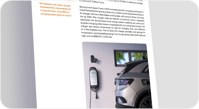 The adoption of EVs is growing rapidly worldwide, especially in Europe and the We have also demonstrated bi-directional EV charging and its integration United States. EV adoption will nearly double the electricity consumption of into our Ensemble technology. Using the same proven bi-directional inverter a typical home, since 80% of charging takes place at home. The charging of technology for solar and batteries, we created an IQ Smart EV charger that EVs will require more solar and storage because in many geographies, the grid can both charge and discharge an EV based on CHArge de MOve (CHAdeMO) does not have the capacity to serve the increased demand this presents; we and the Combined Charging Standard (CCS) protocol. We demonstrated estimate that each EV requires an additional 10-15 kWh of stationary storage the vehicle-to-home (V2H) use case, where the vehicle is providing power and around 2-3 kWp of solar. to a home while the utility grid is down, and the vehicle-to-grid (V2G) use case where the vehicle is discharging and providing power back to the home “EV adoption will nearly double We acquired ClipperCreek in 2021 and entered the EV charging market with a for self-consumption or exporting to the utility grid to earn incentives. We the electricity consumption of brand that stands for quality and service. In 2023, we introduced the IQ Smart continue to collaborate with car makers to ensure interoperability and plan a typical home, since 80% of EV charger into the United States and Canada, with plans to follow in Europe to make the product available to the market in 2025 when more vehicles charging takes place at home.” during 2024. This charger features internet connectivity and is integrated with bi-directional capability are released. seamlessly into the Enphase home energy system, enabling use cases such as green charging, which means charging the EV only using clean energy. This charger also allows homeowners to view EV charging, solar, and batteries all in the Enphase App. The IQ Smart EV charger provides cost savings for homeowners, avoiding taking energy from the grid when utility tari rates are high, such as NEM 3.0 in California. The IQ Smart EV charger integrates seamlessly into the Enphase home energy system Enphase bi-directional EV chargers enables EVs to provide power to a home during an outage 28 ENPHASE CEO LETTER TO SHAREHOLDERS 2023 29