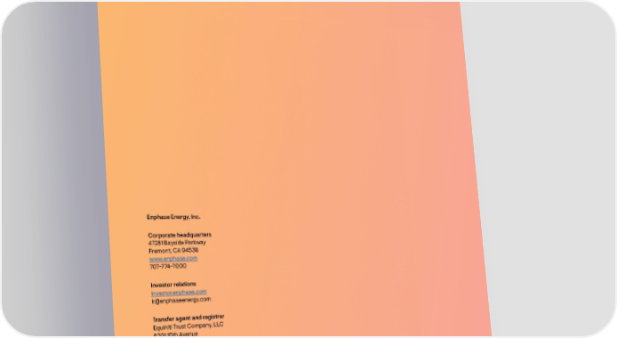 Enphase Energy, Inc. Corporate headquarters 47281 Bayside Parkway Fremont, CA 94538 www.enphase.com 707-774-7000 Investor relations investor.enphase.com [email protected] Transfer agent and registrar Equiniti Trust Company, LLC 6201 15th Avenue Brooklyn, NY 11219 www.equiniti.com 800-468-9716 Independent registered public accounting 昀椀rm Deloitte & Touche LLP Stock exchange listing Enphase Energy, Inc. common stock trades on the NASDAQ Global Market under the symbol ENPH Financial and investor information is available on the company’s investor relations website at investor.enphase.com 46