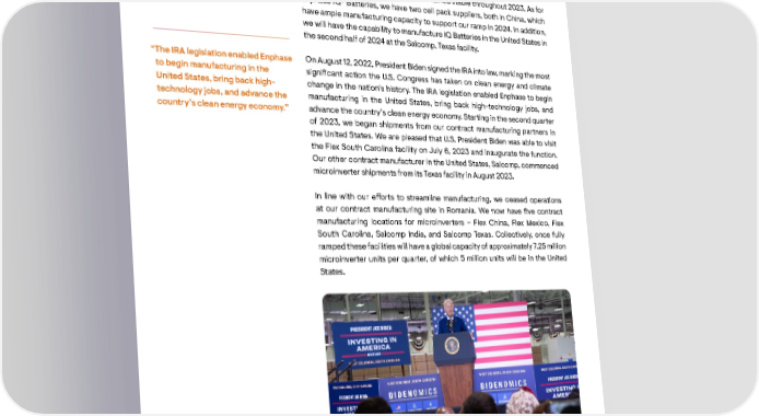 A presidential Our operations team did an outstanding job in enabling microinverter shipments from our contract groundbreaking manufacturing facilities in the United States The microinverter supply landscape remained stable throughout 2023. As for Enphase IQ® Batteries, we have two cell pack suppliers, both in China, which have ample manufacturing capacity to support our ramp in 2024. In addition, we will have the capability to manufacture IQ Batteries in the United States in the second half of 2024 at the Salcomp, Texas facility. “The IRA legislation enabled Enphase On August 12, 2022, President Biden signed the IRA into law, marking the most to begin manufacturing in the signicant action the U.S. Congress has taken on clean energy and climate United States, bring back high- change in the nation’s history. The IRA legislation enabled Enphase to begin technology jobs, and advance the manufacturing in the United States, bring back high-technology jobs, and country’s clean energy economy.” advance the country’s clean energy economy. Starting in the second quarter of 2023, we began shipments from our contract manufacturing partners in the United States. We are pleased that U.S. President Biden was able to visit the Flex South Carolina facility on July 6, 2023 and inaugurate the function. Our other contract manufacturer in the United States, Salcomp, commenced microinverter shipments from its Texas facility in August 2023. In line with our eorts to streamline manufacturing, we ceased operations at our contract manufacturing site in Romania. We now have ve contract manufacturing locations for microinverters – Flex China, Flex Mexico, Flex South Carolina, Salcomp India, and Salcomp Texas. Collectively, once fully ramped these facilities will have a global capacity of approximately 7.25 million microinverter units per quarter, of which 5 million units will be in the United States. President Joe Biden, Congressman James Clyburn of South Carolina, and Enphase’s Co-founder Raghu Belur, President Joe Biden at the Flex manufacturing facility event in Columbia, South Carolina at the Flex manufacturing facility event in Columbia, South Carolina 10 ENPHASE CEO LETTER TO SHAREHOLDERS 2023 11