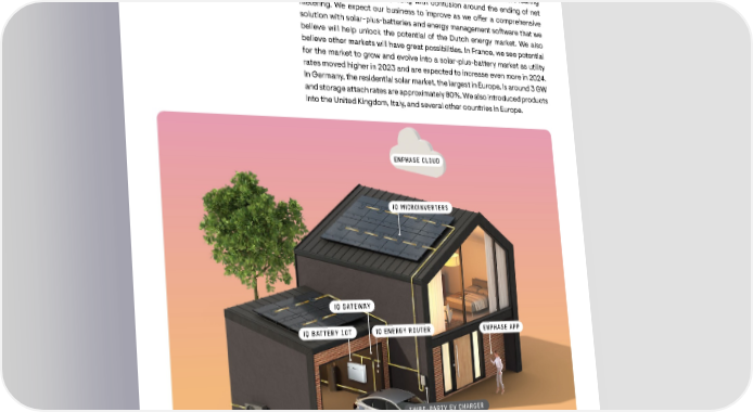 “As we think about our competitive ® Our European business was strong overall in 2023 with a 60% increase from We integrated the IQ Energy Router products from our GreenCom Networks 2022, despite plummeting demand in the second half of 2023, which required positioning in Europe, we see acquisition into our home energy management systems (HEMS) in Germany, us to make rapid inventory corrections in the channel. Our three largest complex power markets such as Austria, and Switzerland during 2023. These products have the ability to markets in Europe continued to be in the Netherlands, France, and Germany. dynamic taris and home energy network third-party EV chargers and heat pumps with Enphase solar-plus- In the Netherlands, demand was impacted because consumers were fearing management needs play right into battery systems. The benet to homeowners is reduced electricity bills due to our strengths.” ® an export penalty for solar, along with confusion around the ending of net increased self-consumption, and control via the Enphase App. As we think metering. We expect our business to improve as we oer a comprehensive about our competitive positioning in Europe, we see complex power markets solution with solar-plus-batteries and energy management software that we such as dynamic taris and home energy management needs play right into our believe will help unlock the potential of the Dutch energy market. We also strengths. Our complete HEMS solutions can help homeowners navigate these believe other markets will have great possibilities. In France, we see potential complex taris and manage EVs and heat pumps, all from their Enphase App. for the market to grow and evolve into a solar-plus-battery market as utility rates moved higher in 2023 and are expected to increase even more in 2024. Coming to the international regions, we introduced our IQ8™ family of In Germany, the residential solar market, the largest in Europe, is around 3 GW microinverters and third-generation batteries in Australia. We also started and storage attach rates are approximately 80%. We also introduced products shipping our 480 W IQ8P™ Microinverters to support the growing demand for into the United Kingdom, Italy, and several other countries in Europe. high-powered solar panels in Brazil, India, and Mexico. ENPHASE CLOUD IQ MICROINVERTERS IQ GATEWAY IQ BATTERY 10T IQ ENERGY ROUTER ENPHASE APP THIRD-PARTY EV CHARGER THIRD-PARTY HEAT PUMP A typical Home Energy Management System in Europe Enphase App showing solar, battery, EV, and heat pump 8 ENPHASE CEO LETTER TO SHAREHOLDERS 2023 9