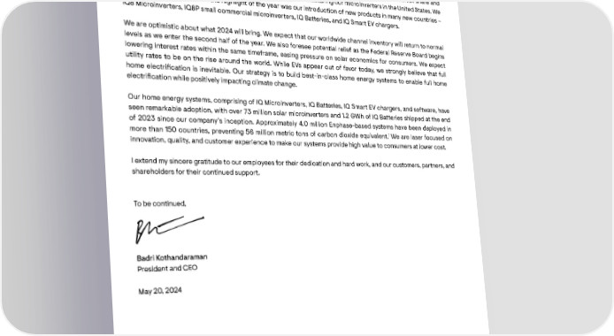The power of Final thoughts the sun at your In summary, 2023 was a challenging year for the solar industry given the macroeconomic conditions. Despite these challenges, we managed to hold our ground compared to our industry peers. We maintained our market share and focused on supporting our customers. Notably, we started manufacturing our microinverters in the United States. We ngertips were protable in 2023, but the highlight of the year was our introduction of new products in many new countries – IQ8 Microinverters, IQ8P small commercial microinverters, IQ Batteries, and IQ Smart EV chargers. Make, use, save, and sell your own powerWe are optimistic about what 2024 will bring. We expect that our worldwide channel inventory will return to normal levels as we enter the second half of the year. We also foresee potential relief as the Federal Reserve Board begins lowering interest rates within the same timeframe, easing pressure on solar economics for consumers. We expect utility rates to be on the rise around the world. While EVs appear out of favor today, we strongly believe that full home electrication is inevitable. Our strategy is to build best-in-class home energy systems to enable full home electrication while positively impacting climate change. Our home energy systems, comprising of IQ Microinverters, IQ Batteries, IQ Smart EV chargers, and software, have seen remarkable adoption, with over 73 million solar microinverters and 1.2 GWh of IQ Batteries shipped at the end of 2023 since our company’s inception. Approximately 4.0 million Enphase-based systems have been deployed in 1 more than 150 countries, preventing 56 million metric tons of carbon dioxide equivalent. We are laser focused on innovation, quality, and customer experience to make our systems provide high value to consumers at lower cost. I extend my sincere gratitude to our employees for their dedication and hard work, and our customers, partners, and shareholders for their continued support. To be continued, Badri Kothandaraman President and CEO May 20, 2024 1 Estimate based on Enphase managed systems data as of December 31, 2023 grossed up for non-managed systems based on cumulative production records; CO₂e calculations based on U.S. Environmental Protection Agency (U.S. EPA) GHG calculator The Enphase App 40 ENPHASE CEO LETTER TO SHAREHOLDERS 2023 41