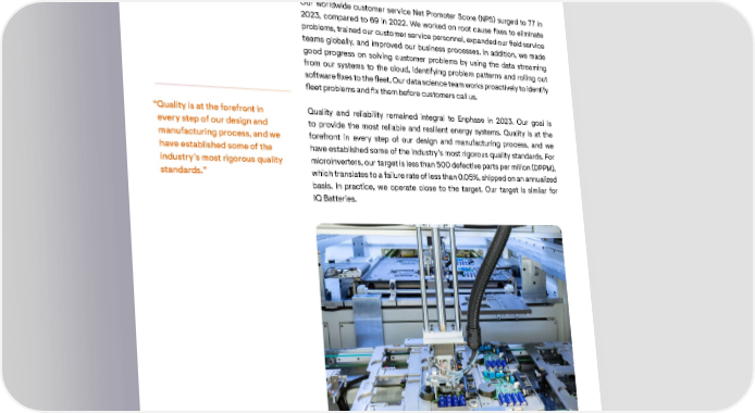 We remained unwavering in our dedication to Our installer training programs continued to expand in 2023. We oered more enhancing customer experience, fortied our training than 45 dierent certication and qualication courses on our products, and they are available in 18 native languages across the United States, initiatives globally, and broadened the reach of our Latin America, Europe, South Africa, Australia, and Brazil. We expanded our installer network installer training programs for our batteries in 2023 and have certied more than 4,700 installers worldwide for our IQ Batteries. We have more than Our worldwide customer service Net Promoter Score (NPS) surged to 77 in 12 regional training centers spread across the United States, and use vans 2023, compared to 69 in 2022. We worked on root cause xes to eliminate equipped with our products to bring training to installers in remote locations problems, trained our customer service personnel, expanded our eld service across the United States and Puerto Rico. We also have dedicated training teams globally, and improved our business processes. In addition, we made events in the United Kingdom, the Netherlands, Belgium, France, Spain, Italy, good progress on solving customer problems by using the data streaming Austria, Germany, Poland, Sweden, Denmark, South Africa, Australia, the from our systems to the cloud, identifying problem patterns and rolling out Philippines, Thailand, India, and Brazil, with more planned in 2024. Training is software xes to the eet. Our data science team works proactively to identify also available on demand via our YouTube channels spanning the globe, where eet problems and x them before customers call us. we currently have more than 6,000 subscribers. “Quality is at the forefront in Quality and reliability remained integral to Enphase in 2023. Our goal is “We expanded our installer training In addition, by the end of 2023, we expanded our Enphase Installer Network every step of our design and to provide the most reliable and resilient energy systems. Quality is at the programs for our batteries in 2023 (EIN) in the United States, Australia, the Netherlands, Belgium, France, the manufacturing process, and we forefront in every step of our design and manufacturing process, and we and have certied more than 4,700 United Kingdom, Mexico, Puerto Rico, and India. Our EIN has been a highly have established some of the have established some of the industry’s most rigorous quality standards. For installers worldwide for our successful initiative as we continue to add trusted installers who act as our industry’s most rigorous quality microinverters, our target is less than 500 defective parts per million (DPPM), IQ Batteries.” product evangelists and are expected to provide exceptional experiences to standards.” which translates to a failure rate of less than 0.05%, shipped on an annualized homeowners across the globe. By the end of 2023, we had approximately 1,750 basis. In practice, we operate close to the target. Our target is similar for installers in our EIN worldwide through a highly selective process focused on IQ Batteries. installation quality and homeowner experience. Manufacturing line at our Flex contract manufacturing facility in Columbia, South Carolina Installer training in the Sacramento, California regional training center 16 ENPHASE CEO LETTER TO SHAREHOLDERS 2023 17