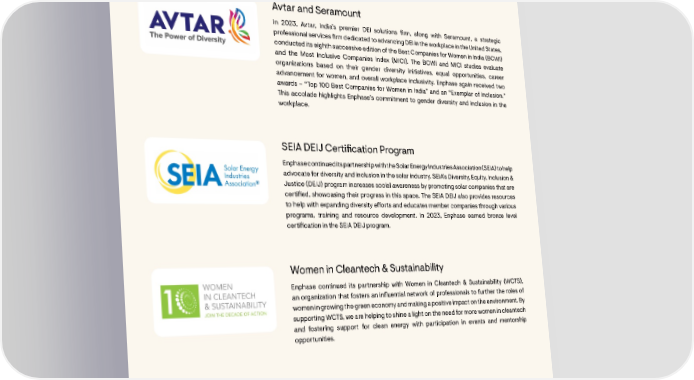DEI organizations and partnerships Avtar and Seramount In 2023, Avtar, India’s premier DEI solutions 昀椀rm, along with Seramount, a strategic professional services 昀椀rm dedicated to advancing DEI in the workplace in the United States, conducted its eighth successive edition of the Best Companies for Women in India (BCWI) and the Most Inclusive Companies Index (MICI). The BCWI and MICI studies evaluate organizations based on their gender diversity initiatives, equal opportunities, career advancement for women, and overall workplace inclusivity. Enphase again received two awards – “Top 100 Best Companies for Women in India” and an “Exemplar of Inclusion.” This accolade highlights Enphase’s commitment to gender diversity and inclusion in the workplace. SEIA DEIJ Certi昀椀cation Program Enphase continued its partnership with the Solar Energy Industries Association (SEIA) to help advocate for diversity and inclusion in the solar industry. SEIA’s Diversity, Equity, Inclusion & Justice (DEIJ) program increases social awareness by promoting solar companies that are certi昀椀ed, showcasing their progress in this space. The SEIA DEIJ also provides resources to help with expanding diversity e昀昀orts and educates member companies through various programs, training and resource development. In 2023, Enphase earned bronze level certi昀椀cation in the SEIA DEIJ program. Women in Cleantech & Sustainability Enphase continued its partnership with Women in Cleantech & Sustainability (WCTS), an organization that fosters an in昀氀uential network of professionals to further the roles of women in growing the green economy and making a positive impact on the environment. By supporting WCTS, we are helping to shine a light on the need for more women in cleantech and fostering support for clean energy with participation in events and mentorship opportunities. 4848
