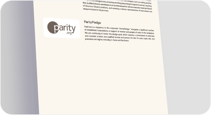 CEO Action for D&I Enphase’s CEO signed the CEO Action for Diversity & Inclusion pledge in 2021, joining more than 2,000 other CEOs, to act on supporting more inclusive workplaces. We continued our pledge to promote diversity in our leadership team and implemented changes focused on attracting more quali昀椀ed and diverse talent into the company such as making positive changes in our hiring process, including rewriting job postings to appeal to women, requiring that quali昀椀ed diverse candidates must be interviewed for all new executive-level and Board of Directors (Board) positions, and ensuring a diverse representation of interviewers are always included in the process. ParityPledge Enphase is a signatory to the corporate “ParityPledge,” alongside a signi昀椀cant number of established corporations, in support of women and people of color in the workplace. We are continuing to honor the pledge goal, which requires a commitment to interview and consider at least one quali昀椀ed woman and person of color for every open role, vice president and higher, including C-Suite and the Board. ENVIRONMENTENVIRONMENTAL, SOCIAL, AND GOVERNANCE REPORT 2023AL, SOCIAL, AND GOVERNANCE REPORT 2023 4949