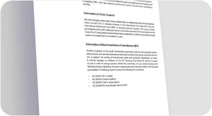 US Department of Energy I2X program In 2023, Enphase submitted a proposal to the U.S. Department of Energy (DOE) to study the impact of PCS on utility service transformers. The project was selected for funding and assigned to Paci昀椀c Northwest National Labs (PNNL) which will conduct the research. Enphase worked with several utilities to de昀椀ne the goals and objectives of the project and is supplying PNNL with high resolution performance data for actual systems operating in the 昀椀eld. International Code Council We work alongside other clean energy stakeholders, in collaboration with the International Code Council (ICC) to develop changes to the International Fire Code (IFC) and the International Residential Code (IRC) to develop practical solutions. The group actively participates in the code-making process to recommend solutions for future versions of the Code. The IFC has gained increased importance, especially in California, as energy storage systems are beginning to be installed at scale. International Electrotechnical Commission (IEC) The IEC is a global, not-for-pro昀椀t membership organization, whose work underpins quality infrastructure and international trade in electrical and electronic goods. We work with the IEC to support the writing of international codes and standards. Speci昀椀cally, our team is actively engaged as members of the IEC Technical Committee 82, which is scoped to look at solar PV energy systems. Within this committee, we are actively involved with Working Groups 3 (balance of system components) and 6 (inverter safety). We have also participated in working groups to develop the following IEC standards: • IEC 63027 (DC arc fault) • IEC 62109-1 (Inverter safety) • IEC 62109-3 (AC module safety) • IEC 62548 (PV array design requirements) 68
