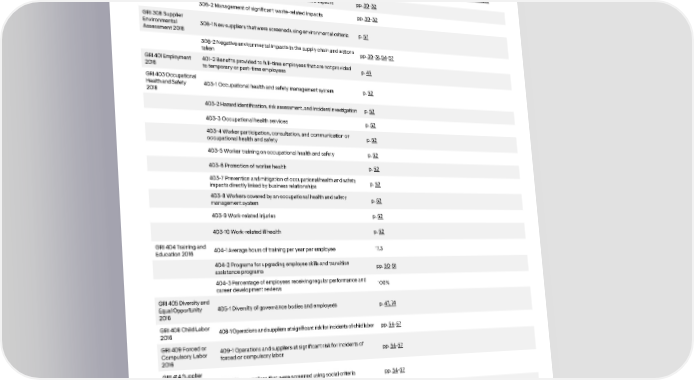 GRI Standard Disclosure Location 305-3 Other indirect (Scope 3) GHG emissions See Environment and Emissions and energy calculation methodologies sections 305-4 GHG emissions intensity See Environment and Emissions and energy calculation methodologies sections 305-5 Reduction of GHG emissions See Environment and Emissions and energy calculation methodologies sections GRI 306 Waste 2020 306-1 Waste generation and signi昀椀cant waste-related impacts pp. 30-32 306-2 Management of signi昀椀cant waste-related impacts pp. 30-32 GRI 308 Supplier Environmental 308-1 New suppliers that were screened using environmental criteria p. 57 Assessment 2016 308-2 Negative environmental impacts in the supply chain and actions pp. 30-31, 54-57 taken GRI 401 Employment 401-2 Bene昀椀ts provided to full-time employees that are not provided p. 45 2016 to temporary or part-time employees GRI 403 Occupational Health and Safety 403-1 Occupational health and safety management system p. 52 2018 403-2 Hazard identi昀椀cation, risk assessment, and incident investigation p. 52 403-3 Occupational health services p. 52 403-4 Worker participation, consultation, and communication on p. 52 occupational health and safety 403-5 Worker training on occupational health and safety p. 52 403-6 Promotion of worker health p. 52 403-7 Prevention and mitigation of occupational health and safety p. 52 impacts directly linked by business relationships 403-8 Workers covered by an occupational health and safety p. 52 management system 403-9 Work-related injuries p. 52 403-10 Work-related ill health p. 52 GRI 404 Training and 404-1 Average hours of training per year per employee 17.3 Education 2016 404-2 Programs for upgrading employee skills and transition pp. 50-51 assistance programs 404-3 Percentage of employees receiving regular performance and 100% career development reviews GRI 405 Diversity and Equal Opportunity 405-1 Diversity of governance bodies and employees p. 47, 74 2016 GRI 408 Child Labor 408-1 Operations and suppliers at signi昀椀cant risk for incidents of child labor pp. 54-57 2016 GRI 409 Forced or 409-1 Operations and suppliers at signi昀椀cant risk for incidents of Compulsory Labor forced or compulsory labor pp. 54-57 2016 GRI 414 Supplier Social Assessment 414-1 New suppliers that were screened using social criteria pp. 54-57 2016 GRI Customer Health 416-1 Assessment of the health and safety impacts of product and p. 30-31 and Safety 2016 service categories GRI Marketing and 417-2 Incidents of non-compliance concerning product and service Zero Labeling 2016 information and labeling 417-3 Incidents of non-compliance concerning marketing Zero communications GRI 418 Customer 418-1 Substantiated complaints concerning breaches of customer Zero Privacy 2016 privacy and losses of customer data ENVIRONMENTAL, SOCIAL, AND GOVERNANCE REPORT 2023 87