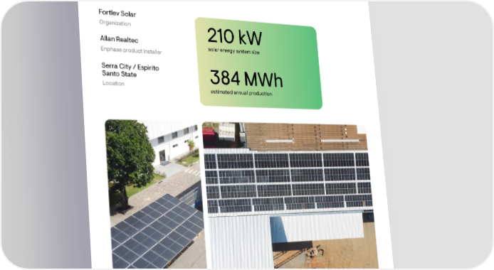 Brazil Fortlev, an Enphase distribution partner in Brazil, chose Enphase microinverters to power its warehouse. The installation includes 627 Enphase IQ7A Microinverters on the roof to generate clean energy and savings for its business. Fortlev Solar Organization 210 kW Allan Realtec solar energy system size Enphase product installer Serra City / Espirito Santo State 384 MWh Location estimated annual production 40