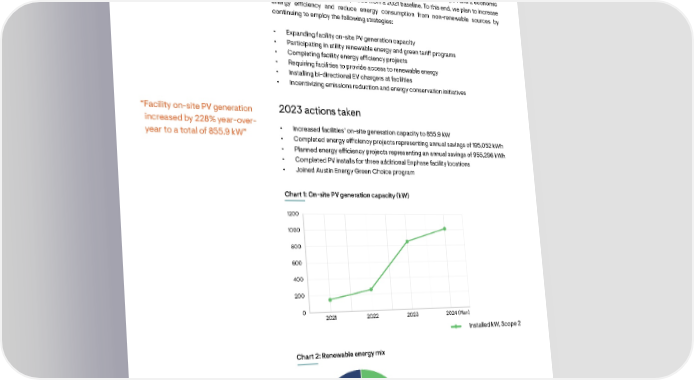 Managing GHG emissions We appreciate the need to reduce operational emissions as we continue growing our business and helping to accelerate the world’s transition to a resilient and e昀케cient renewable energy system. In 2022, we set a target to reduce our Scope 1 and 2 economic emissions intensity by 30% by 2030 from a 2021 baseline. To this end, we plan to increase energy e昀케ciency and reduce energy consumption from non-renewable sources by continuing to employ the following strategies: • Expanding facility on-site PV generation capacity • Participating in utility renewable energy and green tari昀昀 programs • Completing facility energy e昀케ciency projects • Requiring facilities to provide access to renewable energy • Installing bi-directional EV chargers at facilities • Incentivizing emissions reduction and energy conservation initiatives “Facility on-site PV generation 2023 actions taken increased by 228% year-over- • Increased facilities’ on-site generation capacity to 855.9 kW year to a total of 855.9 kW” • Completed energy e昀케ciency projects representing annual savings of 195,052 kWh • Planned energy e昀케ciency projects representing an annual savings of 955,296 kWh • Completed PV installs for three additional Enphase facility locations • Joined Austin Energy Green Choice program Chart 1: On-site PV generation capacity (kW) 1200 1000 800 600 400 200 0 (Plan) 2020.5 2021 2021.5 2022 2022.5 2023 2023.5 2024 2024.5 Installed kW, Scope 2 Chart 2: Renewable energy mix 30% 70% Renewable (%) Non-renewable (%) Renewable (%) Non-renewable (%) 26