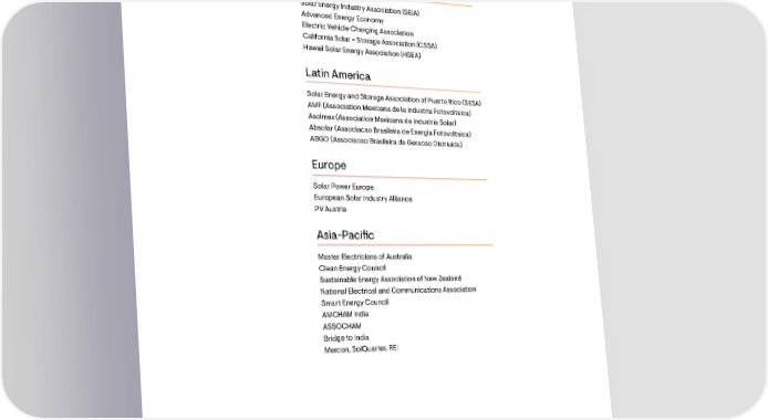 Membership associations North America Solar Energy Industry Association (SEIA) Advanced Energy Economy Electric Vehicle Charging Association California Solar + Storage Association (CSSA) Hawaii Solar Energy Association (HSEA) Latin America Solar Energy and Storage Association of Puerto Rico (SESA) AMF (Association Mexicana de la Industria Fotovoltaica) Asolmex (Association Mexicana de Industria Solar) Absolar (Associacao Brasileira de Energia Fotovoltaica) ABGD (Associacao Brasileira de Geracao Distriuida) Europe Solar Power Europe European Solar Industry Alliance PV Austria Asia-Paci昀椀c Master Electricians of Australia Clean Energy Council Sustainable Energy Association of New Zealand National Electrical and Communications Association Smart Energy Council AMCHAM India ASSOCHAM Bridge to India Mercon, SolQuarter, REI ENVIRONMENTAL, SOCIAL, AND GOVERNANCE REPORT 2023 93