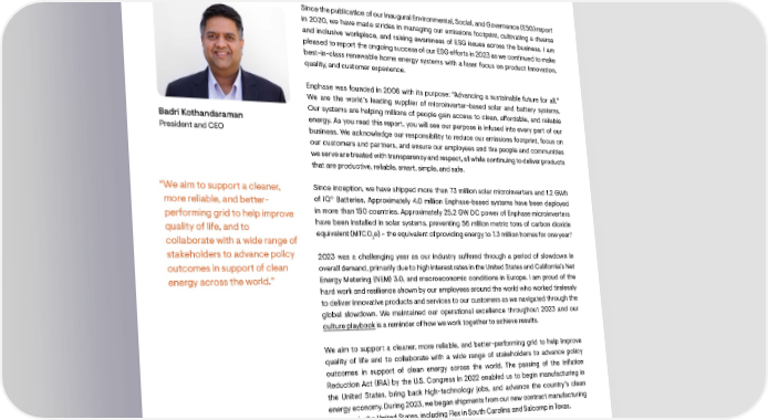 A Letter from our President and CEO Since the publication of our inaugural Environmental, Social, and Governance (ESG) report in 2020, we have made strides in managing our emissions footprint, cultivating a diverse and inclusive workplace, and raising awareness of ESG issues across the business. I am pleased to report the ongoing success of our ESG e昀昀orts in 2023 as we continued to make best-in-class renewable home energy systems with a laser focus on product innovation, quality, and customer experience. Enphase was founded in 2006 with its purpose: “Advancing a sustainable future for all.” We are the world’s leading supplier of microinverter-based solar and battery systems. Our systems are helping millions of people gain access to clean, a昀昀ordable, and reliable Badri Kothandaraman energy. As you read this report, you will see our purpose is infused into every part of our President and CEO business. We acknowledge our responsibility to reduce our emissions footprint, focus on our customers and partners, and ensure our employees and the people and communities we serve are treated with transparency and respect, all while continuing to deliver products that are productive, reliable, smart, simple, and safe. “We aim to support a cleaner, Since inception, we have shipped more than 73 million solar microinverters and 1.2 GWh ® more reliable, and better- of IQ Batteries. Approximately 4.0 million Enphase-based systems have been deployed performing grid to help improve in more than 150 countries. Approximately 25.2 GW DC power of Enphase microinverters quality of life, and to have been installed in solar systems, preventing 56 million metric tons of carbon dioxide equivalent (MTCO 1 e) – the equivalent of providing energy to 7.3 million homes for one year. collaborate with a wide range of 2 stakeholders to advance policy 2023 was a challenging year as our industry su昀昀ered through a period of slowdown in outcomes in support of clean overall demand, primarily due to high interest rates in the United States and California’s Net energy across the world.” Energy Metering (NEM) 3.0, and macroeconomic conditions in Europe. I am proud of the hard work and resilience shown by our employees around the world who worked tirelessly to deliver innovative products and services to our customers as we navigated through the global slowdown. We maintained our operational excellence throughout 2023 and our culture playbook is a reminder of how we work together to achieve results. We aim to support a cleaner, more reliable, and better-performing grid to help improve quality of life and to collaborate with a wide range of stakeholders to advance policy outcomes in support of clean energy across the world. The passing of the In昀氀ation Reduction Act (IRA) by the U.S. Congress in 2022 enabled us to begin manufacturing in the United States, bring back high-technology jobs, and advance the country’s clean energy economy. During 2023, we began shipments from our new contract manufacturing partners in the United States, including Flex in South Carolina and Salcomp in Texas. In 2023, we introduced our products into more countries. We started shipping our IQ8™ Microinverters into 21 countries worldwide. Our IQ Batteries are shipping to customers in North America, Belgium, Austria, France, the Netherlands, Switzerland, Spain, Portugal, Sweden, Denmark, and Greece. We also introduced our latest Enphase® Energy System, powered by IQ8 Microinverters and the IQ Battery 5P. The IQ Battery 5P delivers the best 1 Estimate based on Enphase managed systems data as of December 31, 2023 grossed up for non-managed systems based on performance monitoring data; CO e calculations based on U.S. Environmental Protection Agency (U.S. 2 4 EPA) Greenhouse Gas (GHG) Equivalencies Calculator.
