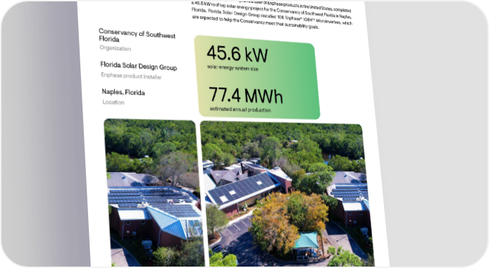 E5. Case studies United States Florida Solar Design Group, an installer of Enphase products in the United States, completed a 45.6 kW rooftop solar energy project for the Conservancy of Southwest Florida in Naples, Florida. Florida Solar Design Group installed 106 Enphase® IQ8H™ Microinverters, which are expected to help the Conservancy meet their sustainability goals. Conservancy of Southwest Florida Organization 45.6 kW Florida Solar Design Group solar energy system size Enphase product installer Naples, Florida 77.4 MWh Location estimated annual production ENVIRONMENTAL, SOCIAL, AND GOVERNANCE REPORT 2023 33