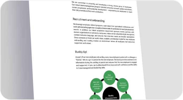 P2. Recruiting and retaining the best We are committed to attracting and developing a strong, diverse group of employees. Our robust talent management program includes university outreach, global recruitment, career progression, and leadership development - empowering our employees to reach their full potential and 昀椀nd work satisfaction. Recruitment and onboarding We leverage employee referral programs, seek talent from specialized conferences, and work with recruiting agencies to supply a diverse slate of candidates for each job placement search. In addition, our talent acquisition department sponsors events, partners with student organizations on university campuses, makes certain all published job descriptions contain inclusive language, and ensures that interview teams are broadly represented. Once someone is hired, our world-class, scalable, and blended model for new employee onboarding and training creates an environment where all employees feel welcomed, supported, and valued. Buddy Up! As part of our new employee onboarding, every new employee is paired with a colleague, a “buddy,” who is a go-to person for the new employee. The buddy provides assistance and information during the settling-in period and ensures that the new employee is engaged and supported. In turn, our buddies bene昀椀t from improved self-con昀椀dence and the ability to hone managerial and leadership skills. Peer (with longer tenure) Maintain positive Technical outlook and and process attitude expert Share Buddy knowledge Characteristics Approachable, (Encourage accessible, self learning) and patient Open-minded Listen actively (No judgements) (Help resolve issues and concerns) 44