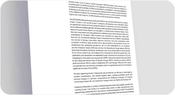 Emissions and energy calculation methodologies Avoided metric tons of carbon dioxide equivalent (MTCO e) 昀椀gures were derived from 2 actual kilowatt-hour (kWh) production of our deployed microinverter 昀氀eet from Enphase’s inception through December 31, 2023 as recorded in our Enlighten™ monitoring database, including a gross up factor of 1.2 to account for deployed systems which are not monitored in the Enlighten database. The conversion of kWh production to carbon dioxide equivalent 昀椀gures was made using the U.S. EPA Greenhouse Gas Equivalencies calculator. The 2023 GHG emissions inventory follows the GHG Protocol Corporate Standard, covering Scope 1, Scope 2, and certain Scope 3 categories. All emissions were calculated using an operational control and location-based method for electricity and heat consumption across all leased facilities globally. We forgo market products to reduce emissions, so the reported location-based 昀椀gures are equivalent to market-based emissions 昀椀gures. Note that heat consumption was only gathered for facilities located in North America. Electricity consumption for European o昀케ce locations was estimated by square foot using data from the U.S. Commercial Buildings Energy Consumption Survey (CBECS), representing two percent of energy consumption reported. Electricity and heat consumption were converted to MTCO e using emission factor data provided in the Emissions Factors for 2 Greenhouse Gas Inventories provided by the U.S. EPA (eGRID2021) for U.S. locations and the Emissions Factors 2021 data set from the International Energy Agency (IEA) for international locations. Emissions calculations cover those attributable to carbon dioxide (CO ), nitrous oxide (N O), and methane (CH ) resulting from electricity generation, heat 2 2 4 generation, and transmission and distribution losses. Emissions are converted to CO e by 2 multiplying by their global warming potential (GWP), referencing default factors provided by the Intergovernmental Panel on Climate Change (IPCC). Hydro昀氀uorocarbons (HFCs), per昀氀uorocarbons (PFCs), sulphur hexa昀氀uoride (SF), and nitrogen tri昀氀uoride (NF ) gases 3 are excluded from our inventory, as facilities under our operational control do not produce signi昀椀cant amounts of these GHGs. The data supporting Scope 3 disclosures was provided by our third-party travel agency, contract manufacturers, and internal logistics team, covering purchased goods and services (category 1), upstream transportation and distribution (category 4), business commuting (category 6), and downstream transportation and distribution (category 9). Emissions attributable to contract manufacturing were made using supplier-speci昀椀c data, covering Scope 1 and Scope 2 of manufacturing activity at eight manufacturing sites, representing substantially all of total contract manufacturing spend in 2023. The emissions disclosed represent only that fraction of activity attributable to the manufacture of Enphase products. 84