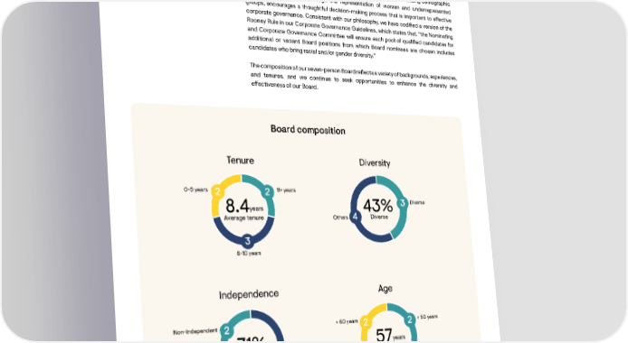 Board diversity and independence We are committed to ensuring that our Board is e昀昀ective and serving the long-term interests of our shareholders. We believe that our Board should represent diversity of thought, background, skill, experience, and expertise. We recognize that enhancing demographic diversity on the Board, through the representation of women and underrepresented groups, encourages a thoughtful decision-making process that is important to e昀昀ective corporate governance. Consistent with our philosophy, we have codi昀椀ed a version of the Rooney Rule in our Corporate Governance Guidelines, which states that, “the Nominating and Corporate Governance Committee will ensure each pool of quali昀椀ed candidates for additional or vacant Board positions from which Board nominees are chosen includes candidates who bring racial and/or gender diversity.” The composition of our seven-person Board re昀氀ects a variety of backgrounds, experiences, and tenures, and we continue to seek opportunities to enhance the diversity and e昀昀ectiveness of our Board. Board composition Tenure Diversity 0-5 years 2 2 11+ years 3 Diverse years 8.4 43% Average tenure Others 4 Diverse 3 6-10 years Independence Age Non-Independent 2 > 60 years 2 2 < 50 years 71% 57years Independent 5 Average age Indepedent 3 50-60 years 74