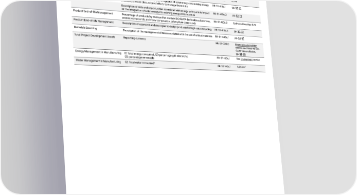 SASB index Topic Accounting Metrics Code Response Hazardous Waste Management Amount of hazardous waste generated , percentage recycled RR-ST-150a.1 1.03 MT, 100%, see p. 32 Number and aggregate quantity of reportable spills, quantity recovered RR-ST-150a.2 0, n/a Management of Energy Infrastructure Description of risks associated with integration of solar energy into existing energy RR-ST-410a.1 pp. 63-70 Integration & Related Regulations infrastructure and discussion of e昀昀orts to manage those risks Description of risks and opportunities associated with energy policy and its impact RR-ST-410a.2 pp. 63-70 on the integration of solar energy into existing energy infrastructure Product End-of-life Management Percentage of products by revenue that contain IEC 62474 declarable substances, RR-ST-410b.3 Estimated less than 0.1% arsenic compounds, antimony compounds, or beryllium compounds Product End-of-life Management Description of approach and strategies to design products for high-value recycling RR-ST-410b.4 pp. 30, 32 Materials Sourcing Description of the management of risks associated with the use of critical materials RR-ST-440a.1 pp. 54-57 Total Project Development Assets Reporting currency RR-ST-000.C Financial sustainability section and GAAP to Non- GAAP Reconciliation, pp. 98-99 Energy Management in Manufacturing (1) Total energy consumed, (2) percentage grid electricity, RR-ST-130a.1 See Environment section (3) percentage renewable Water Management in Manufacturing (2) Total water consumed* RR-ST-140a.1 5,223 m3 *Water consumption information collected for certain operations in North America only. Water consumption was drawn from municipal supplies. 88