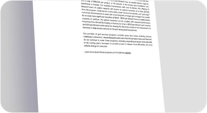 Connecticut Energy Storage Solutions Program Connecticut homeowners who install Enphase IQ Batteries and are electric customers of United Illuminating or Eversource Energy are eligible to enroll in the Energy Storage Solutions program. Enrolled homeowners currently receive an upfront incentive from the Connecticut Green Bank of at least $250 per kilowatt-hour of useable battery capacity with a cap of $16,000 per project, or 50 percent of the battery plus installation cost (whichever is lowest). For example, homeowners with two IQ Battery 5Ps o昀昀ering 10 kilowatt-hours of usable capacity will receive an upfront incentive of at least $2,500 from the program. Underserved communities, lower-income households, and “grid edge” customers (homeowners in areas with more frequent or longer grid outages) may qualify for an even more signi昀椀cant incentive of $450 - $900 per kilowatt-hour of usable battery capacity. In addition, the upfront incentive can be coupled with seasonal performance incentives from United Illuminating or Eversource of up to $200 per kilowatt each summer and $25 per kilowatt each winter for sharing the electricity stored in the homeowner’s IQ Batteries to help reduce demand on the grid during peak load periods. Our portfolio of grid services programs currently spans nine states, including Arizona, California, Connecticut, Hawaii, Massachusetts, New York, Rhode Island, Texas, and Vermont. As we continue to scale these programs, including expanding programs internationally in the coming years, we expect to provide access to cleaner, more a昀昀ordable, and more reliable energy for everyone. Learn more about these programs on the Enphase website. ENVIRONMENTAL, SOCIAL, AND GOVERNANCE REPORT 2023 65