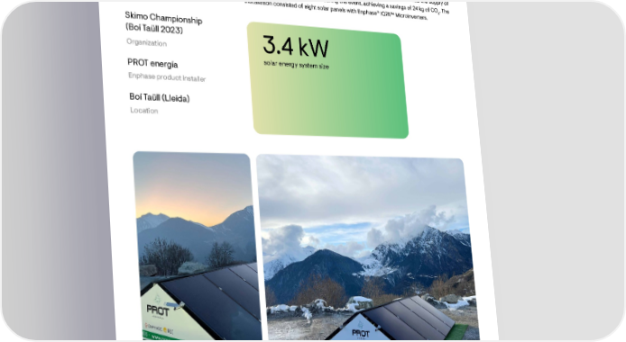Spain PROT energía, an installer of Enphase products in Spain, performed a temporary solar installation for exhibition during the world ski mountaineering championship in the Catalan Pyrenees to promote the use of renewable energy. The installation covered the supply of 12% of the electricity consumed during the event, achieving a savings of 24 kg of CO . The 2 ® installation consisted of eight solar panels with Enphase IQ7A™ Microinverters. Skimo Championship (Boí Taüll 2023) 3.4 kW Organization solar energy system size PROT energía Enphase product installer Boí Taüll (Lleida) Location 36